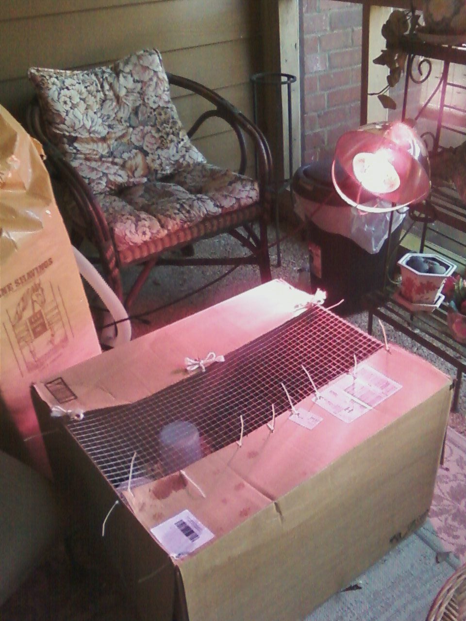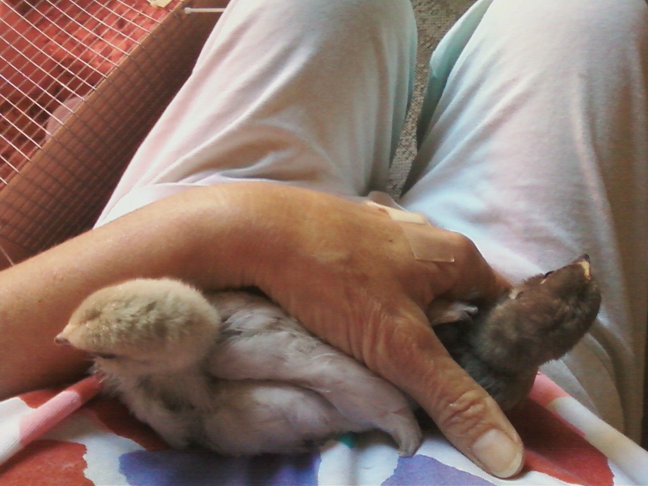 New fotos of the babies. They are starting to feather. They grow up so fast. Also a foto of my make-shift brooder. It has worked great. Of course, they want to always be together and are quite loud about being separated. They are content in my hands as long as I am holding both of them. LOLTheir combs are still completely pale with no hint of pink. Still hoping they are both girls.![]()