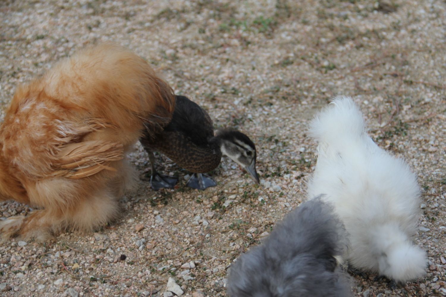 That is so interesting. I've never bathed a chicken, although we have bathed the bunnies. I remember when Kuntrygirl bathed her Tom turkey during the big rains, poor turkey was cold and wet and very muddy, if i remember correctly.Hey everybody. Been absent for a while...it's good to be back. I've been going back and forth from here to SW GA. My grandmother was not doing well and passed last Thursday at the age of 93 years. The matriarch of quite a family - 106 children, grand, great and great, great grandchildren - her life was dedicated to them and to farming the land A truly remarkable woman. My summers and vacation days spent on that farm led me to getting chickens. Every time one of my roosters crow I'm reminded of those times. Now, back to chickens. Welcome to all the new Lay-ers!! Julie, even without working at it you still hold the title of Broody Farms! LOL You're new babies are so cute. I have a few new pictures to share with you. Skittles is growing up so fast. He's 6 weeks old now and never ventures too far from his "mom" Ginger, a 19 week old Silkie.I'm 99% sure he's a drake. The tufting and green coloring is beginning to show on his head.