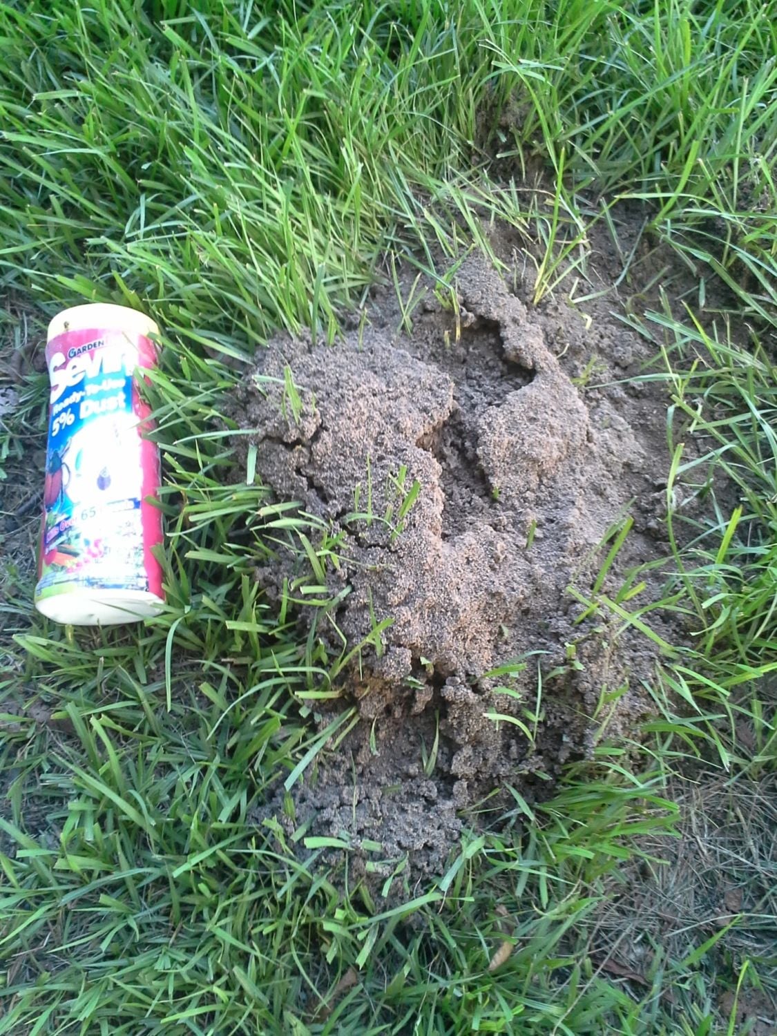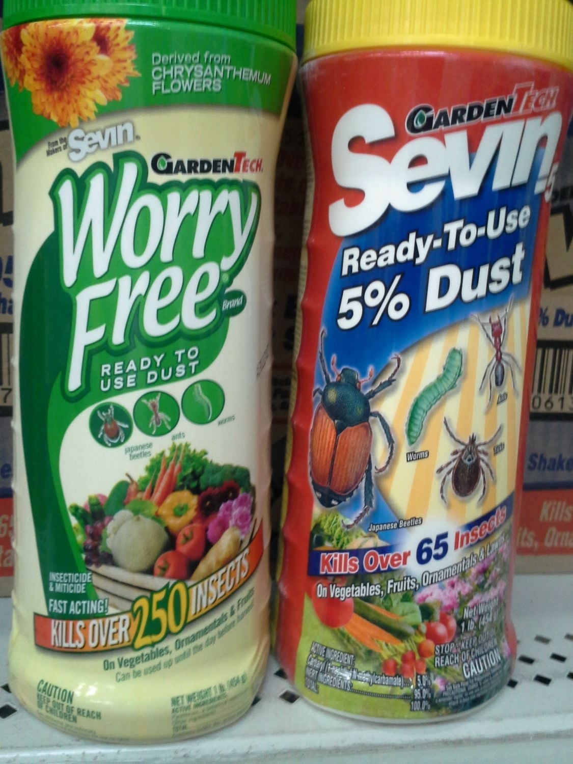 So, I went to WalMart for the 3rd time this morning to get more Sevin Dust and I noticed another container on the side of the original Sevin Dust (red container) that I normally buy. Has anyone saw this one before? It says I called the 1-800 on the internet and talked to the a rep of the company and she said that is is food grade and that this one is BETTER than the Sevin Dust in the red container. She said this one is "organic" because it is made from Chrysanthemums Flowers. I bought a container this morning I noticed that the Sevin Dust in the red container kills over 65 insects and the other container kills over 250 insects. Who knew that there were that many insects. I will have to get a list of those 250 insects. This is what I'm battling with. I have about 100 piles of them all over. :barnie I am averaging 1/2 container per ant pile. There's gotta be a better way. Gas and a match is sound better by the minute.