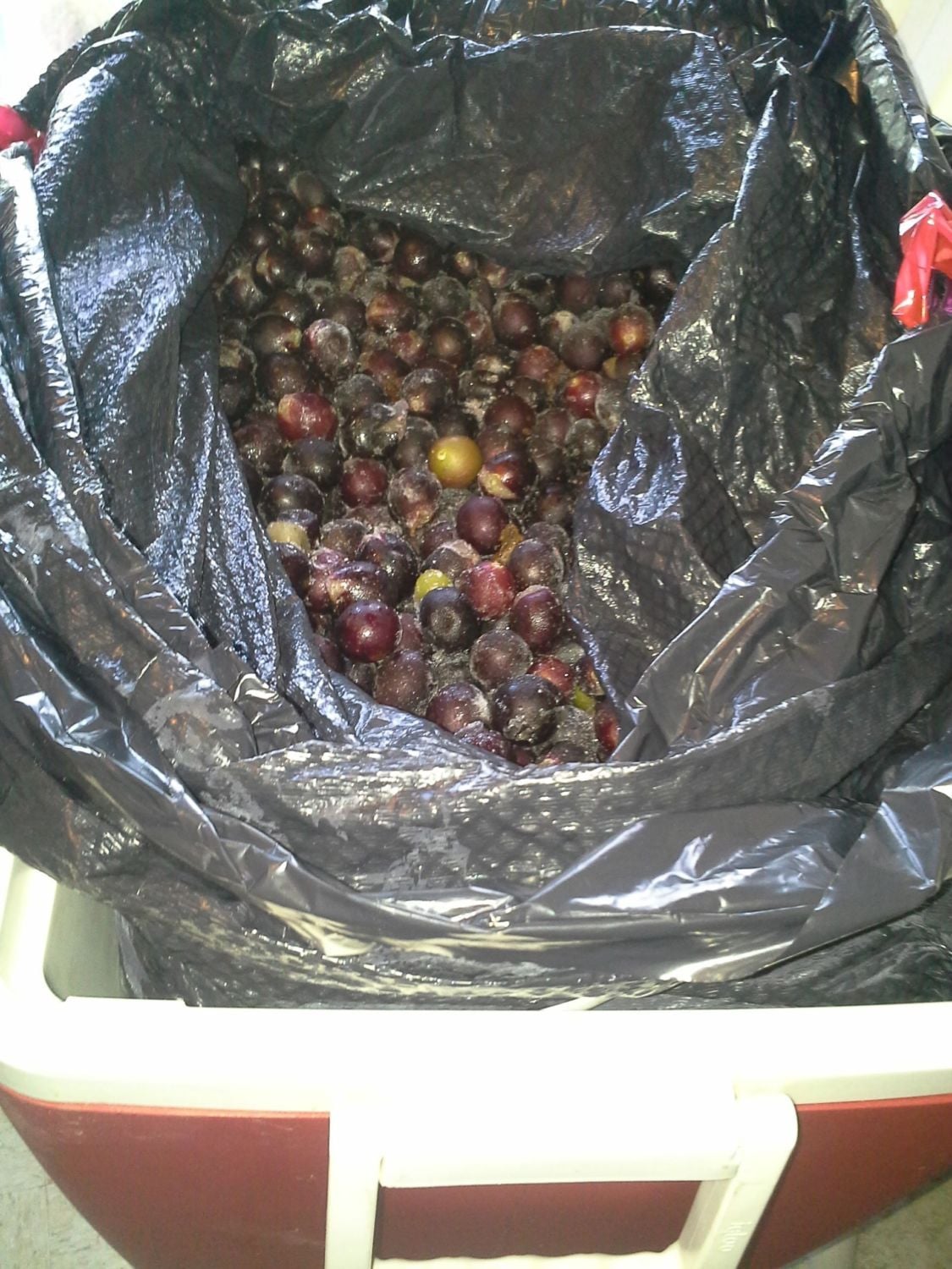 So about 4:00 PM, I set out to meet my co-worker who was picking up some more muscadine for me. I met a very nice guy that belongs to the same wine forum/online group that I do and I was asking about muscadine and he said that he would give me some muscadine . Well things worked out perfect because he lives in Vacherie, LA and I had no idea how was I going to get to Vacherie, LA to get muscadine when I could buy some because the gas to get there would be the same if not more that I would pay for muscadine. So, it worked out perfect because my co-worker is from Vacherie, LA and she went home this weekend, so she was able to pick up the muscadine for me. The guy told me that whoever picked them up to bring an ice chest because they would be frozen. Well, when he said bring an ice chest, I wasn't thinking about how many, I was only thinking about keeping them frozen until they reached me. Well, when I met my co-worker and she said that she needed help getting the muscadine out of her car, I was like, "What? You need help? How heavy can it be?" Well, lo and behold when I helped her to get the ice chest out of her truck and opened up the ice chest, I almost fainted when I saw how many muscadine this man had sent back for me. There were so many in there. My co-worker texted me later to tell me that her mom called and said she left some muscadine in the freezer.. I was like, "OH MY!" :th