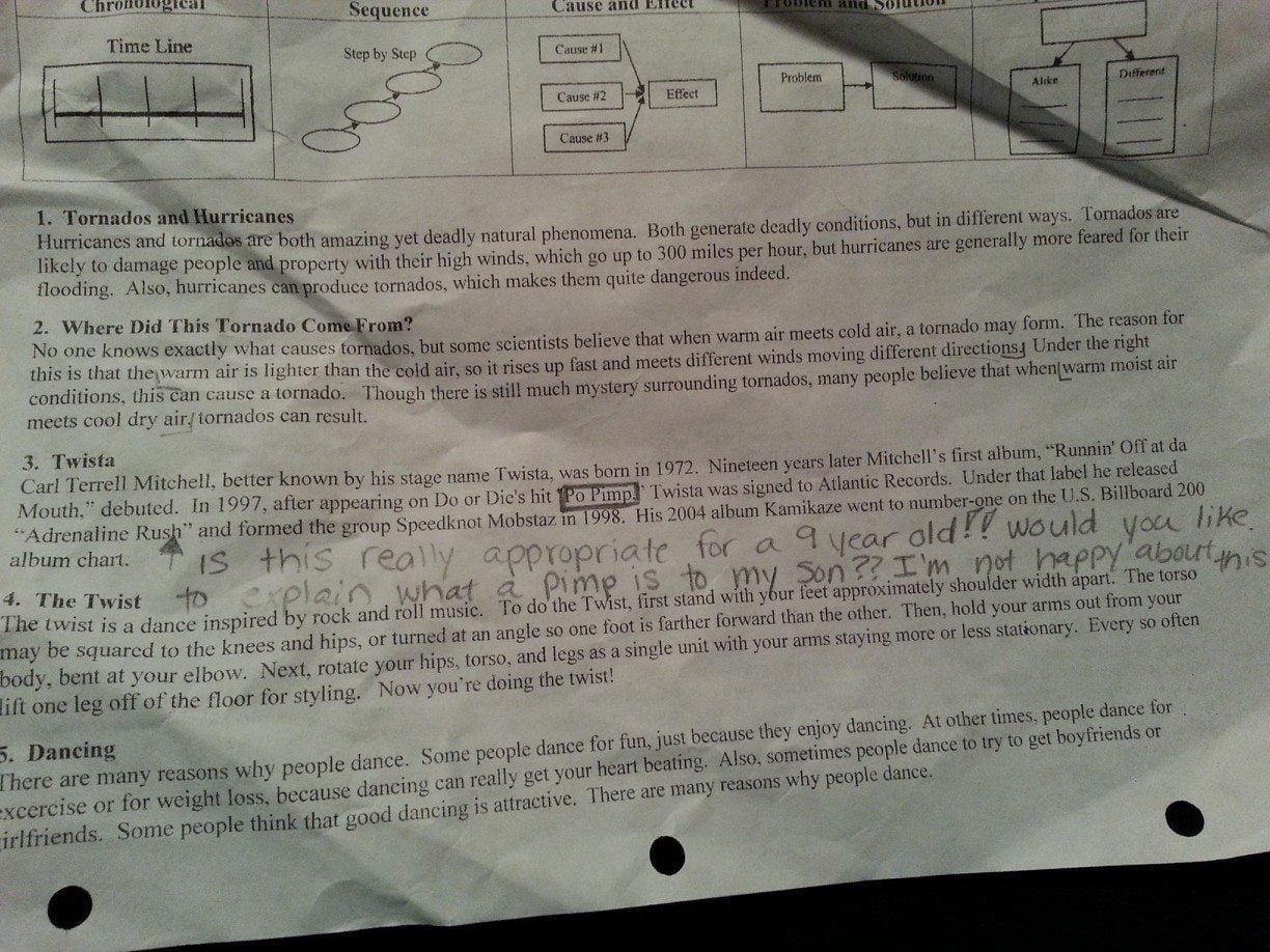 Same here. If it were my child, I would have been at the school first thing that next morning. I goggled the lyrics and y'all don't even wanna know. I couldn't copy and paste to here because I would have been banned from BYC.Time for a visit to the school office!!!! What's the saying....I'd be all over that like "white on rice"!!!! I have never heard of Twista either???!!!?? (Perhaps that surprises you)? Ahhh....probably not!!From KLFY Facebook page. They didn't mention this but look at Question #5 as to WHY people dance. HUH???????????????![]()