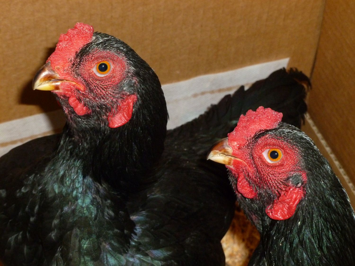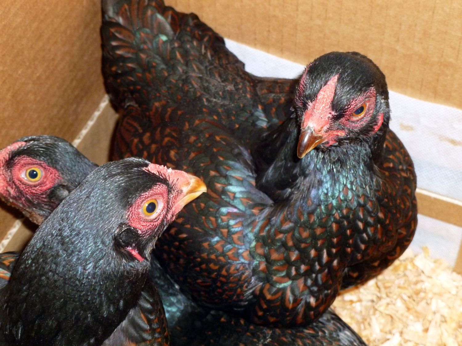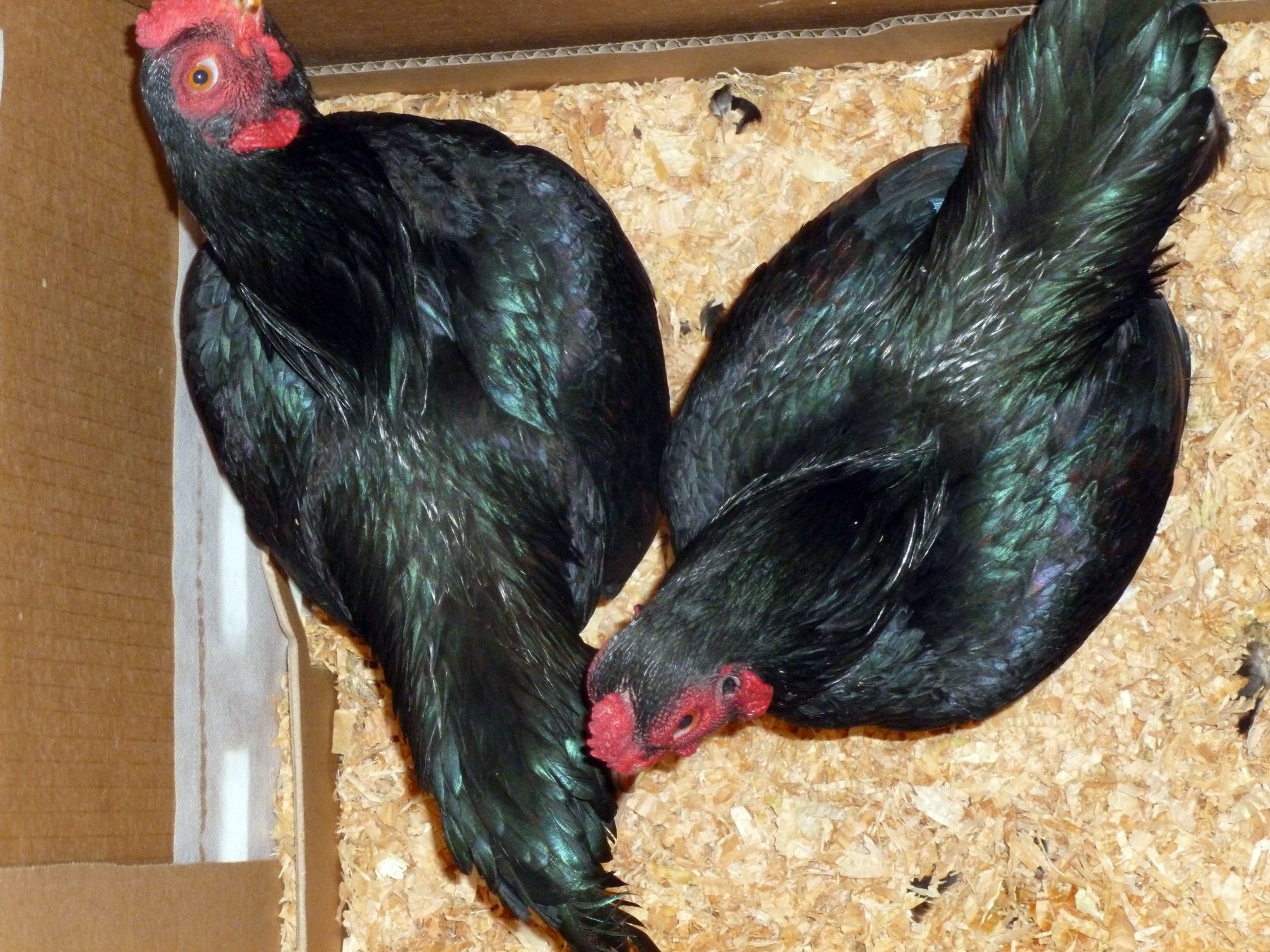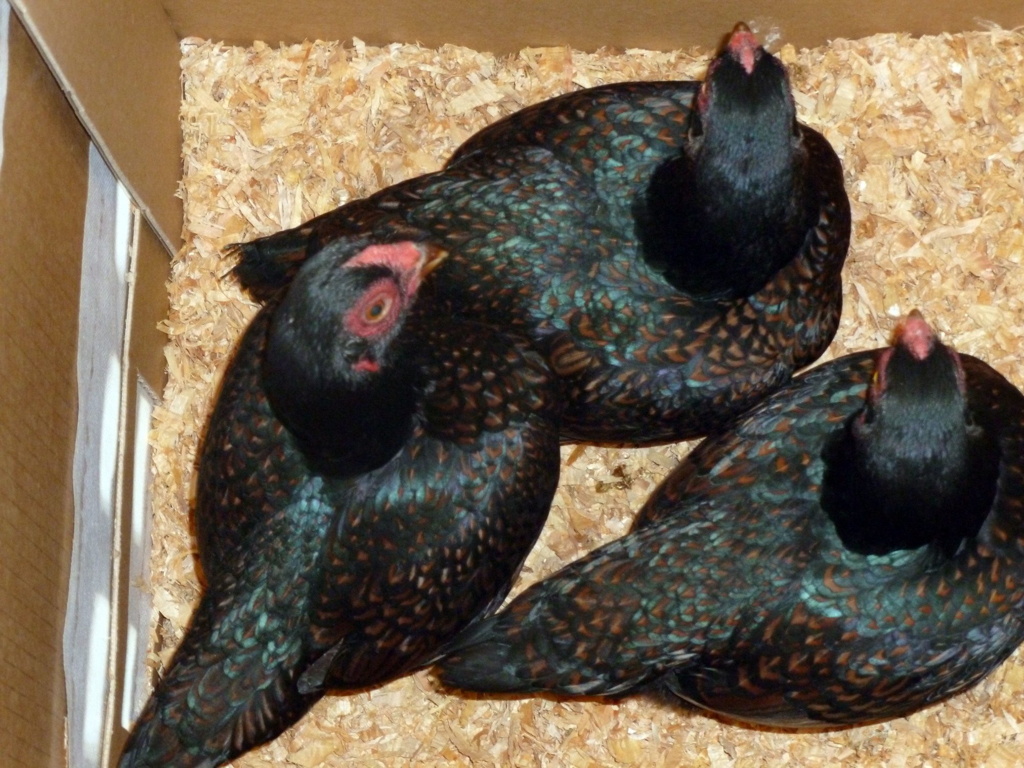 So, I had a box full of Dark Cornish Bantams delivered today. I ordered these from an APA judge and breeder in Oregon this spring: With the recent temperature drop, he was able to ship them yesterday. I ordered a quad and he threw in an extra bird for free! I LOVE these little guys: So soft, great heads, and wonderful feathering!