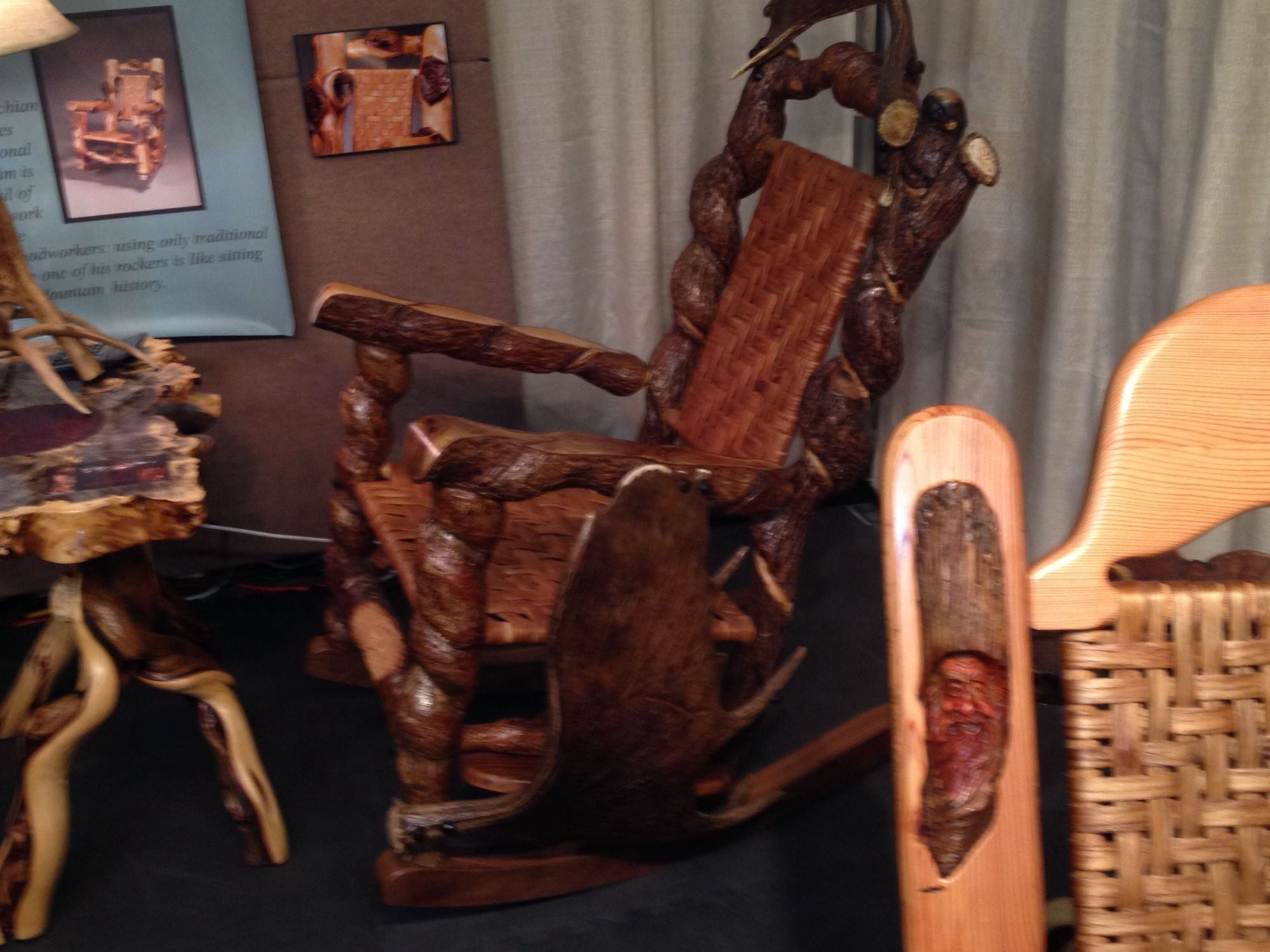 Every piece of the rocker has hand made. the moose antler on the side was a magazine holder. it was 5 kinds of wood. he hand striped the bark and wove it for the seating. Some of it was walnut ,red wood. an he handmade the nails so it looked like antique nails incredible.