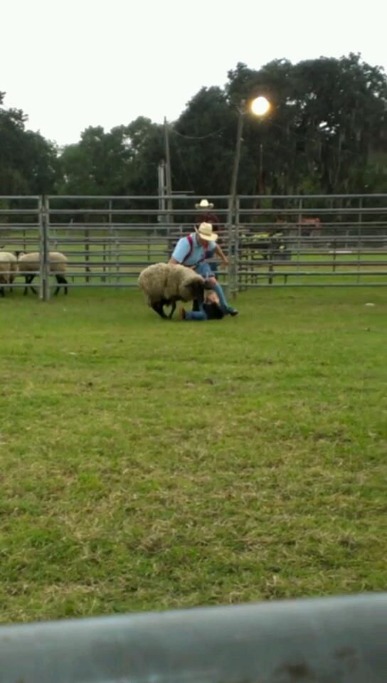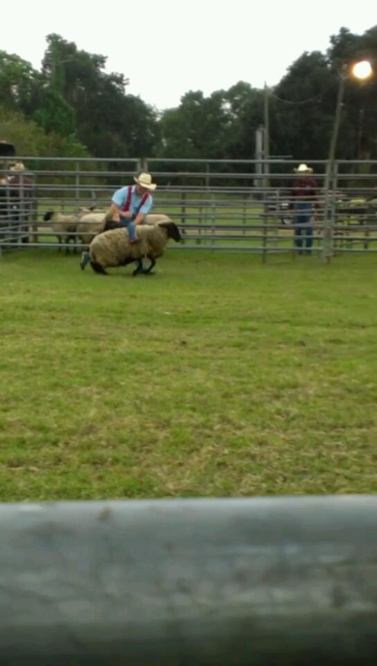 Walks up to the announcer with her and then she's in line for a Sheep rodeo ride-Bell at 6 seconds lol 2nd event a goat tail pull! 2 cowboys pin a goat down butt up in the air, tie a pink ribbon to its tail and then time the little kids running to the goat-snatch the ribbon and run back O.O whoa the sounds coming from those goats!