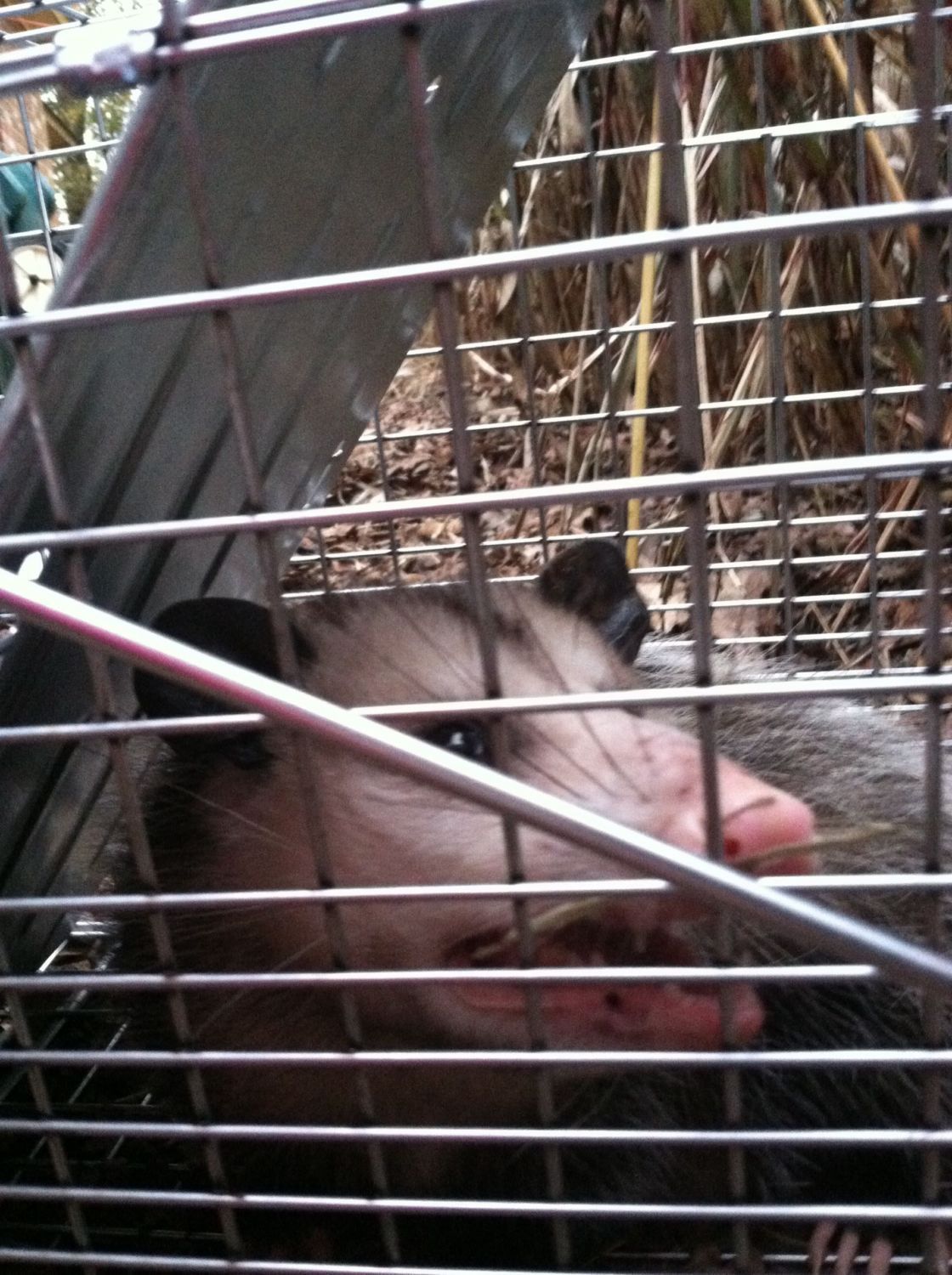 The possum has gone to possum hell. My grandson said that if I killed it in the trap that I wouldn't be able to trap any more bec no other possum would go in. So I did the release and he did the deed. Yea!! One down. I will re-set it tonight.