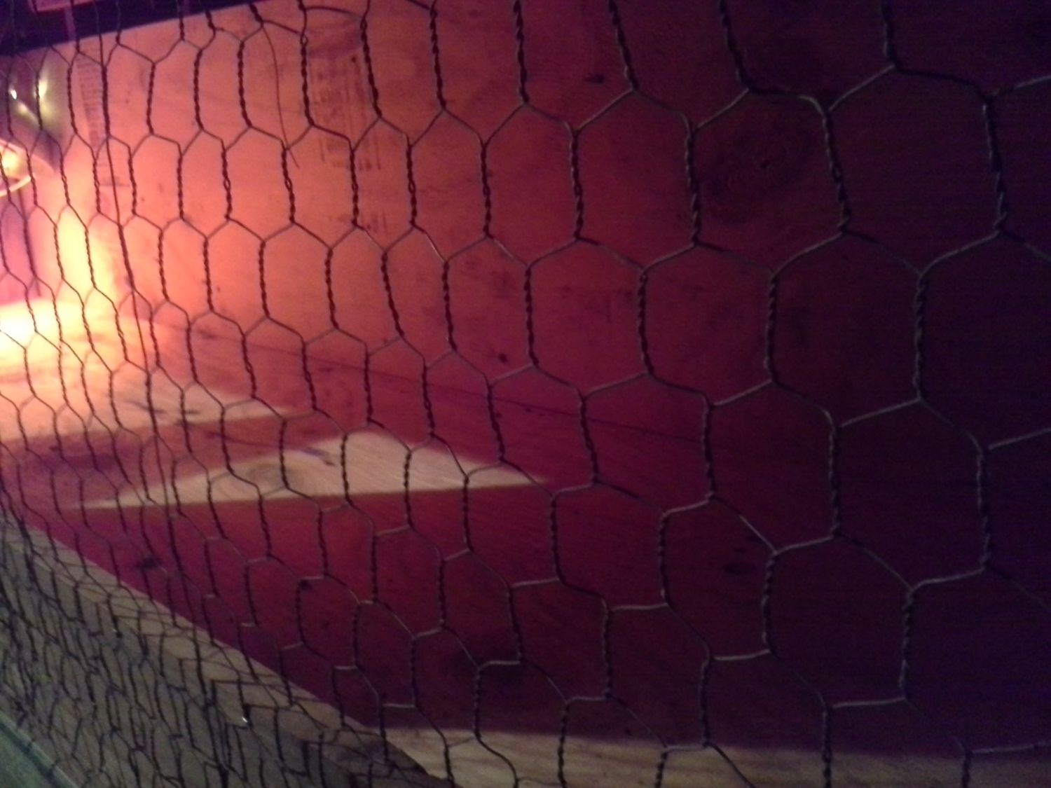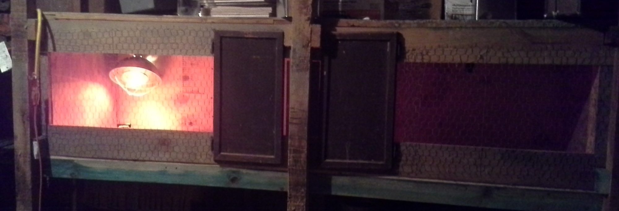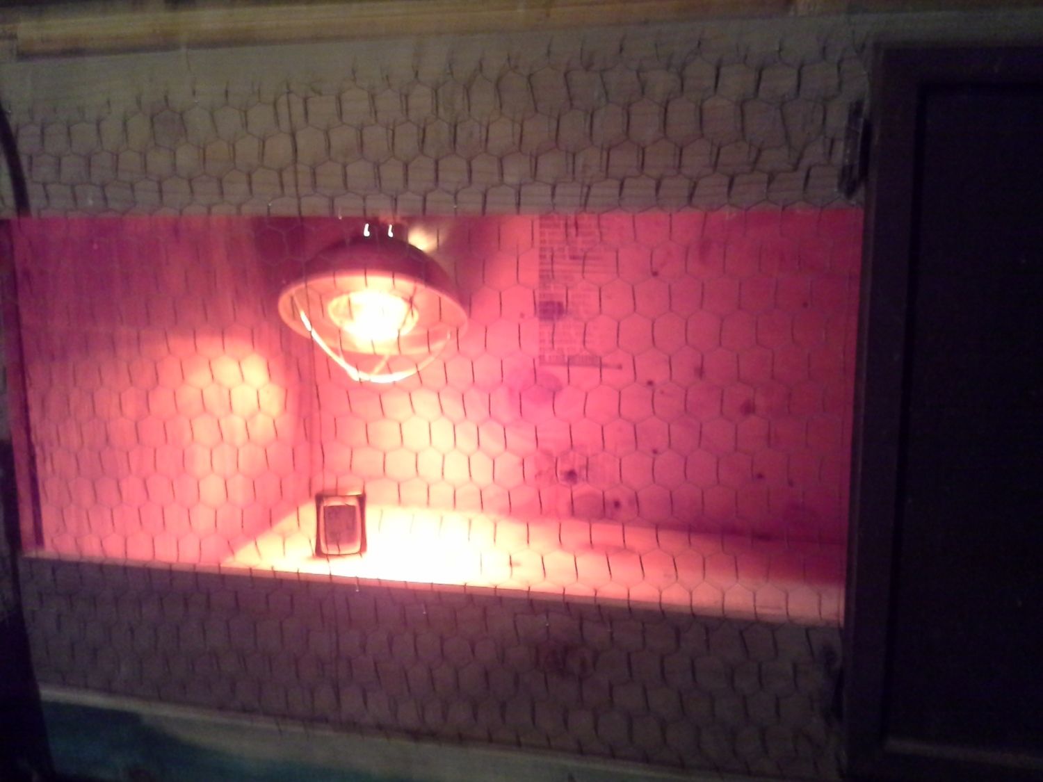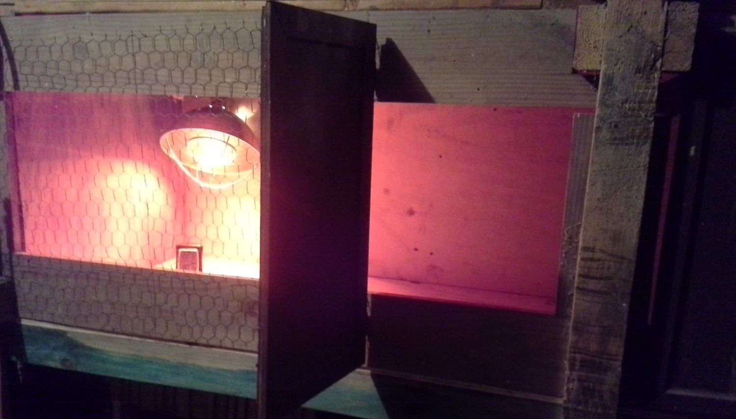 Here are pics of the inside brooder/shelf. I have 3 heat lamps in it. I have tested out the temps and it's holding a steady 99 degrees. I will put the feeders and waterers in this evening. Everything was from recycled stuff. The doors were from a wooden cabinet that an old fish tank sat on.