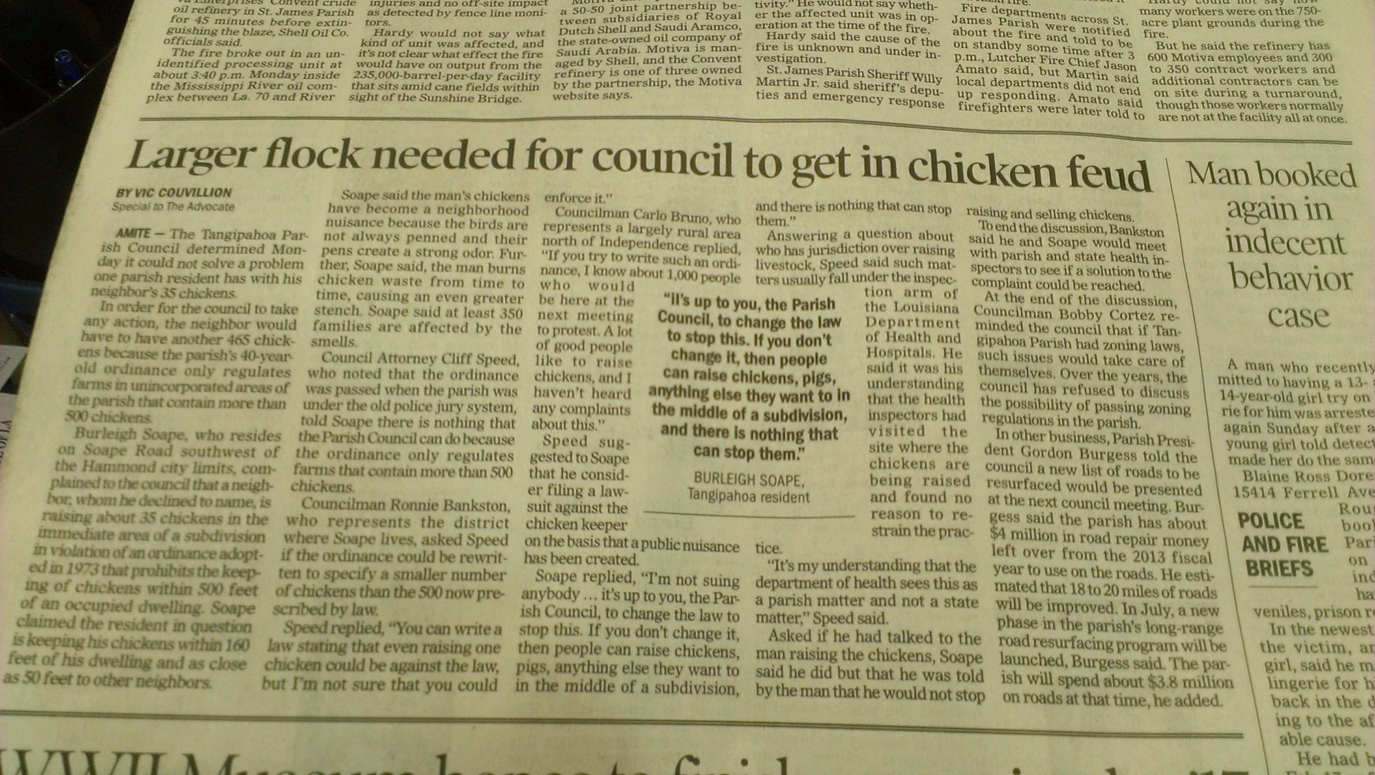 Guy fighting to keep his chickens in amite made the paper :/ news can be helpful but more often all non chicken people see is a band wagon to jump on when they read the articles :/