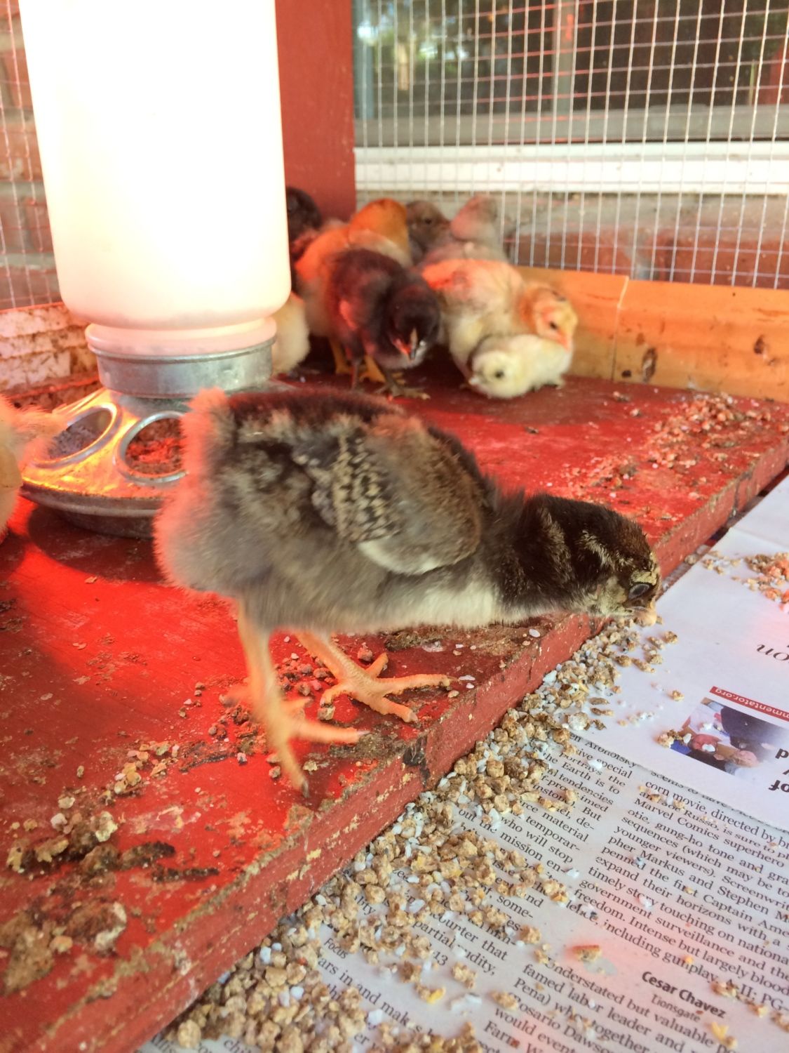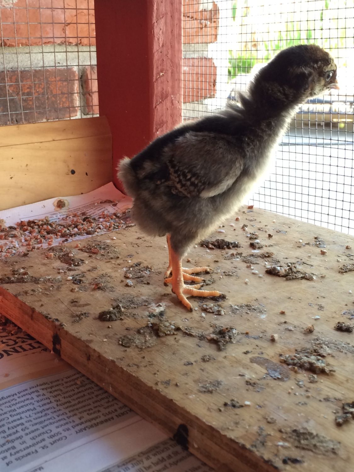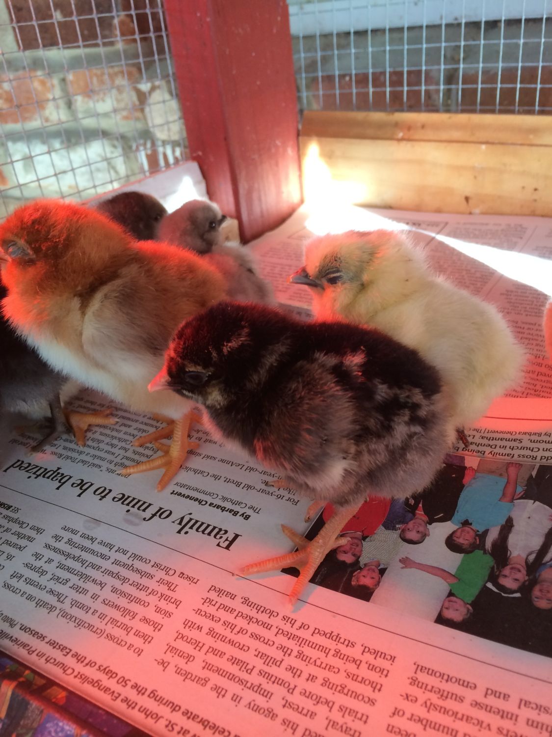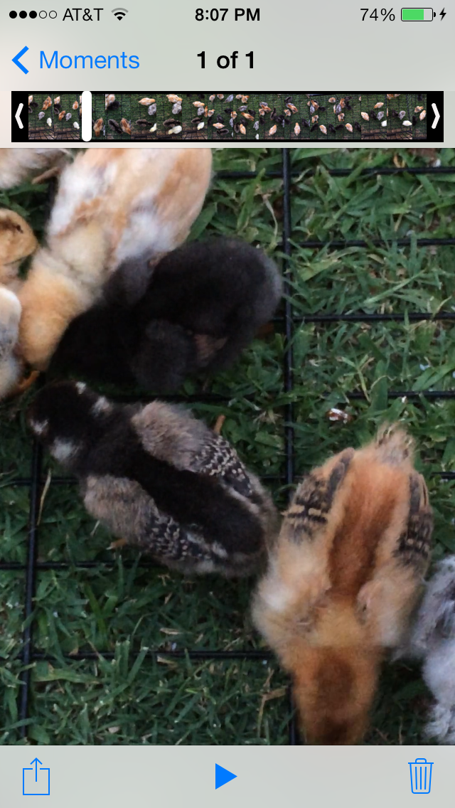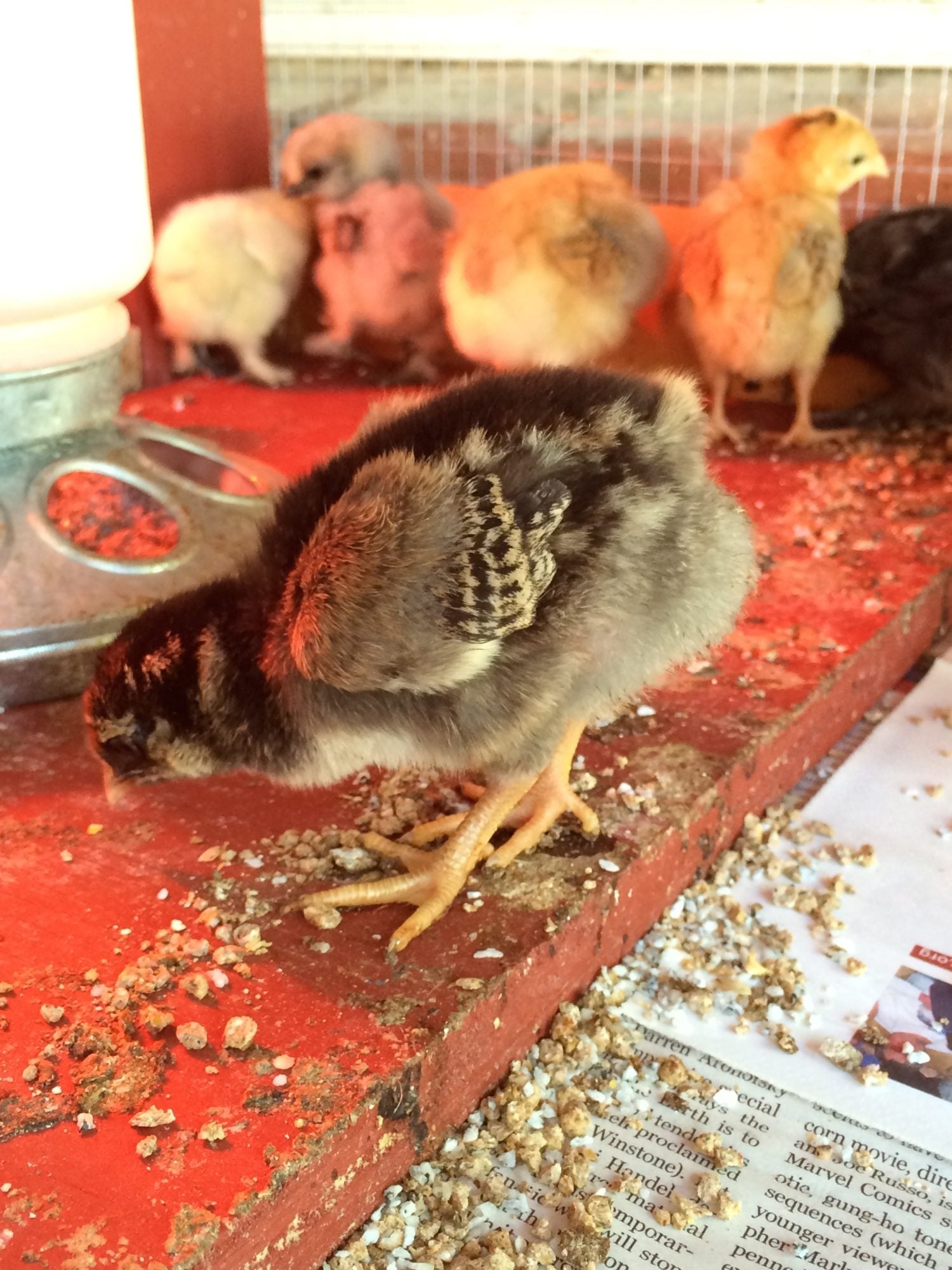 Aw, they are all so cute! The one you are asking about looks a lot like an Easter Egger mix I hatched out.I'm hoping you guys could help me with a color question. I have a mixed flock that has recently been separated, so eggs still aren't pure. Breed wise, I have a pair of red pyle mixed bantams, some sort of blue copper hen, a multi-shade brown hen (looks a bit like a welsummer in coloring), a buff hen with black smutt, a reddish brown rooster, a black silkie pair, and two buff/ light brown hens. I listed all of them because I have a mystery chick whose color I've never seen before. Upon hatch it looked similar to a laced wyandotte, but its feathers are coming in black/dark with a light coloring that resembles barring. Could anyone tell me what color it will grow out to be? First few days:More recent: