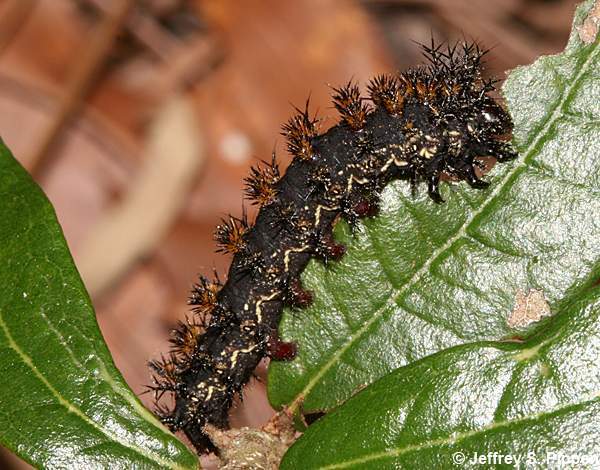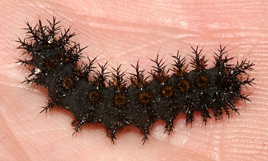 These black and white caterpillars use branching spines to fend off predators. Like the io moth caterpillars, these buck moth caterpillars live gregariously in their early instars. David L. Wagner, author of Caterpillars of Eastern North America notes that a sting he received from a buck moth caterpillar was still visible 10 days later, with hemorrhages at the sites where spines had penetrated his skin.