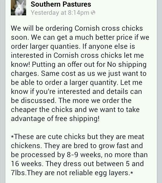 At an order for 100 we would be paying $1.46 each chick. Awesome price but we only need maybe 65 every 3 months to cover our friends and family at Southern Pastures and we don't freeze much meat. Anyone looking for like 30ish chicks at $1.46 price?