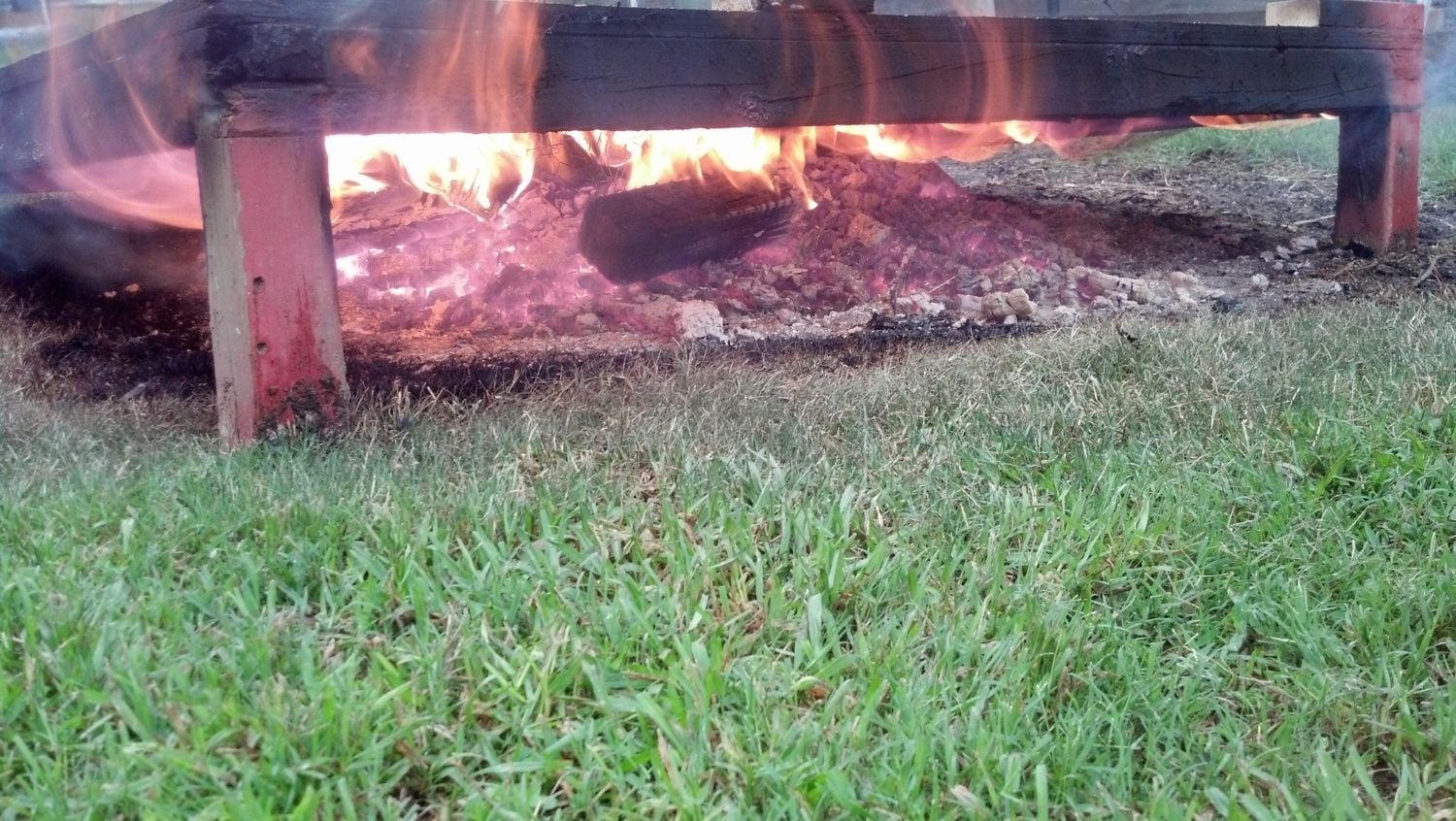 So make jam I did. Sour Cherry with Red Raspberries. OH~MY! DELICIOUS!!! While I was up to my jamming there was mowing and weed eating in the sunny outdoors. At one point I looked outside and saw that he had started a fire and was dismantling the old hen house and had lite it up in serious KUNTRYGIRL fashion