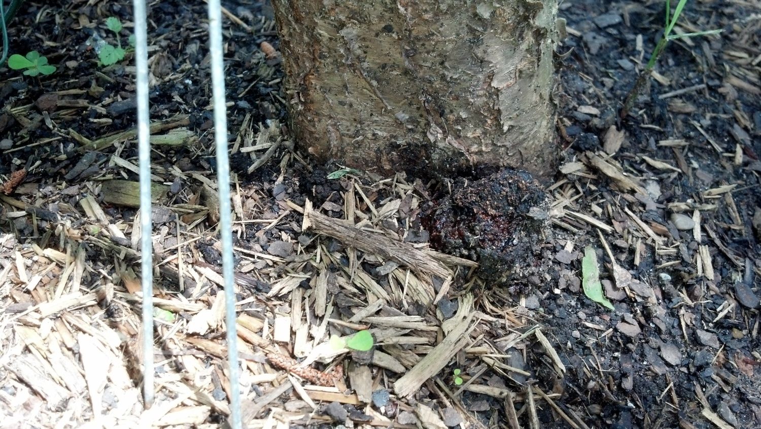 The lumpy area right against the trunk.....its that amber ooze with dirt stuck to it.