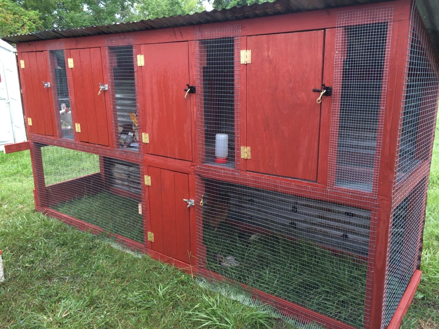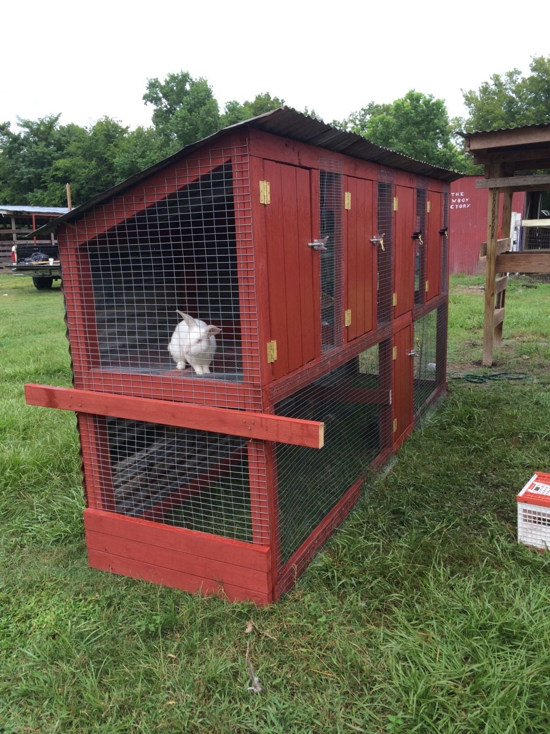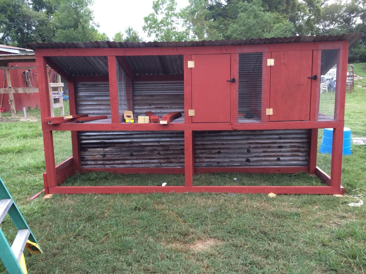 :th We finally finished the pen today. We checked in at around $250, with about 12 hours put in. We could have done things differently, but I am VERY pleased with how it came out. Our biggest goal was saving money while not sacrificing quality. Our doors and locks hardware don't match, but it saved us money and didn't hurt anything but aesthetics. It's already halfway full. :lol: We temporarily put a momma hen with 11 babies in the bottom pen, have a new zealand buck in one pen, and 10 marans chicks in the other. We are supposed to go pick up some more rabbits tomorrow, so it will undoubtedly be full by then. I already want four more just like it!