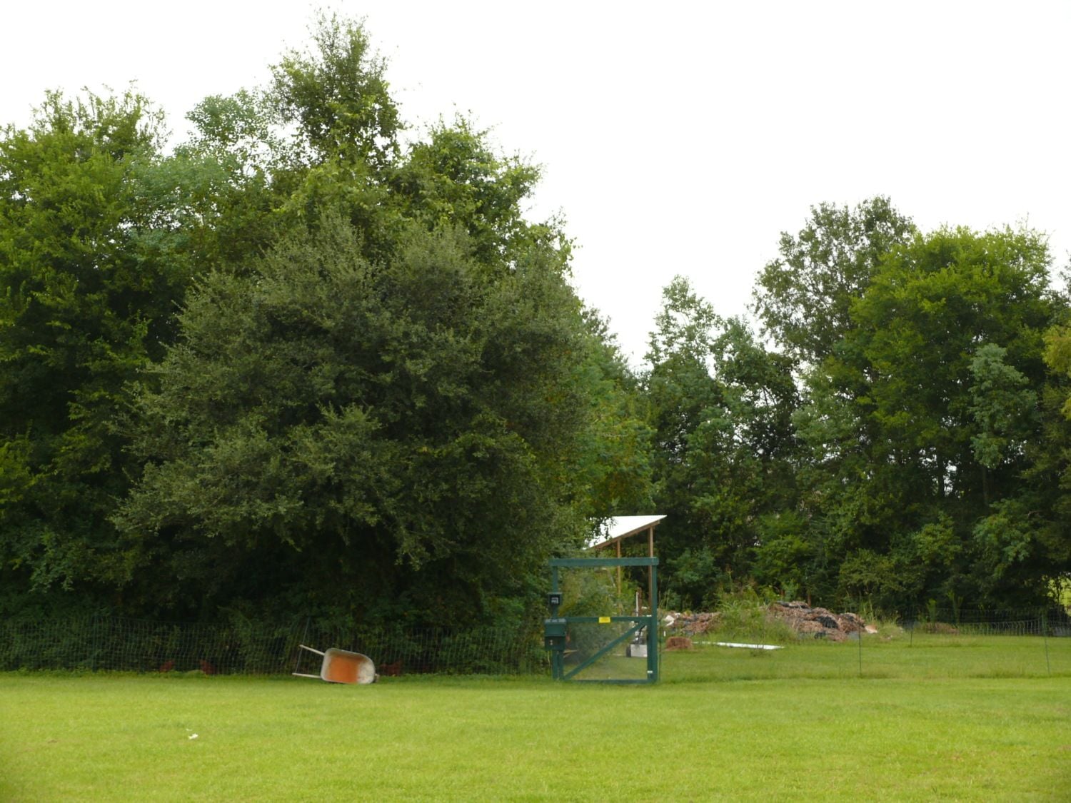 Cody, LindaB, and others, here's some shots of my coop and pen. It's obvious that I'm not finished with the coop with lumber and metal sheeting lying around. I built it with both safety, convenience and possibly expanding the flock in mind. So right now, my 8 RIR have it pretty good. Building the coop totally interrupted my work in the garden, so nature took over and it went to weeds, BIG WEEDS!. It's obvious the soil is very fertile. Now, it's turn about fair play. The coop is far enough along to keep the girls safe and dry, so back to planting a fall garden. I'm very fortunate to have a wooded tree line to the north to somewhat isolate them from a number of houses nearby. And, there's a nice, dense clump of trees immediately to the left of the coop that I've incorporated in the pen. Also, while our lot slopes toward that area, and rainwater moves through that area, the coop is on a little elevated area that was already there. Otherwise, I would have had to have elevated some myself. As mentioned in previous posts - the girls love the tree area and spend most of their time there. It will be interesting to see if they are out in the grassy area more as winter comes on. The coop and pen are at the back of our 8+ acres, so they are pretty much hidden from the road, and I like that too. Here's an approach to the pen. The nice clump of trees is to the left, and beyond the trees to the right is a neighborhood with quite a few houses. (Civilization approaches!!) Looking out of the pen toward our house and road beyond. The fence and the gate are electrified. I haven't yet run power out to this area, so am using a charger that can run on AC or DC. I have a car battery in the box to the right of the gate. My buddy Max is patiently waiting for me to finish taking pictures. The front of coop with a man and a chicken door. The chicken door is open, but is closed at nights. This wall is completely covered with hardware cloth, which is doubled in the bottom two feet. The roof extends out toward me from that wall to help keep rain from blowing inside, and to give the girls a sheltered area without having to go back inside the coop. There are two barrel latches on both doors. Also, with high winds in mind (South Louisiana), I've sloped the roof toward the south to hopefully deflect some of the uplifting. Maybe the trees will help too. I've used a number of metal straps to reinforce the wood-to-wood connections, and used screws to attach the sheet metal for the roof. Yes, I've kinda gone to the extreme. But just too much time, money and energy is invested to not add little features that improve security and stability. I want my Chicken TV to run uninterrupted well after I'm gone. :old In the picture below, looking through the man door, the roost is made from limbs and small trees. I tried to keep the diameter of the top two rungs to about 2", which seems to be the general guideline I've found on the web. You can see a gap between the roof and the wall. This gap runs all the way around to add to the ventilation of the coop. Where the gap is large enough to admit an owl, I've covered it with hardware cloth. On the floor you can see the "deep littler" composed of leaves from bags folks had put out next to the street for pickup. I first learned of this method in Ussery's book. The floor below is dirt, which allows a little moisture and many microorganism's and worms to move up into this material. He and others strongly emphasize the need for much ventilation so as to aid the natural process going on in the littler. So, the hardware covered wall, combined with the gaps up near the roof provide plenty of ventilation. Because of the moisture and natural acid content of the litter, I attached the blue tarp material apron around the inside bottom of the walls to help protect the metal sheeting. While the girls are waiting for me to let them out in the morning, they stay busy scratching around in the littler, which keeps the material stirred up letting plenty of air circulate through it. This method seems to be working very well, there is almost no smell of manure inside the coop. Continuing with the idea of plenty of ventilation, the peak of the roof is about 12 ft. The heat coming off the metal roof is pretty intense in summer, and even though I try to let the girls out into the pen early in the morning, there will be times that I will have to leave them inside all day. Also, having the peak of the roof that high allows for a clearance on the lower (left) side that is easy to walk under. I can remember from childhood when there was a surge in folks near my grandparent's house around Provencal, LA that decided to raise large flocks of chickens for commercial purposes. The long, narrow metal houses for the chickens had roofs too low, and the coops had few if any fans. It didn't take them long to discover that their low investment, high pay-off plans got cooked, literally! I can remember the sheds sitting there slowly deteriorating long after the chickens were gone. As LindaB said earlier, "heat kills a lot more easily than cold". Looking to the left inside the coop, you can see my auto waterer. A handy little device that I ordered off the web that refills itself as water becomes low in the bowl. The time it took to run water all of the way out the coop is really paying off...a constant, reliable supply of fresh water every day, without me having to attend to this except to occasionally rinse out the bowl. Beyond the waterer you can see the entrance to 4 nest boxes. I have a board blocking them right now because I recently painted them, and so I haven't added nesting material. The girls are 17 weeks old, so things should be ready there when they are. Last shot of the coop - you can see the nest boxes projecting out into a covered area where we can gather eggs without standing in the rain or having to go inside the coop. There's a lid giving top access to the boxes. You can barely see a second autowaterer I have out