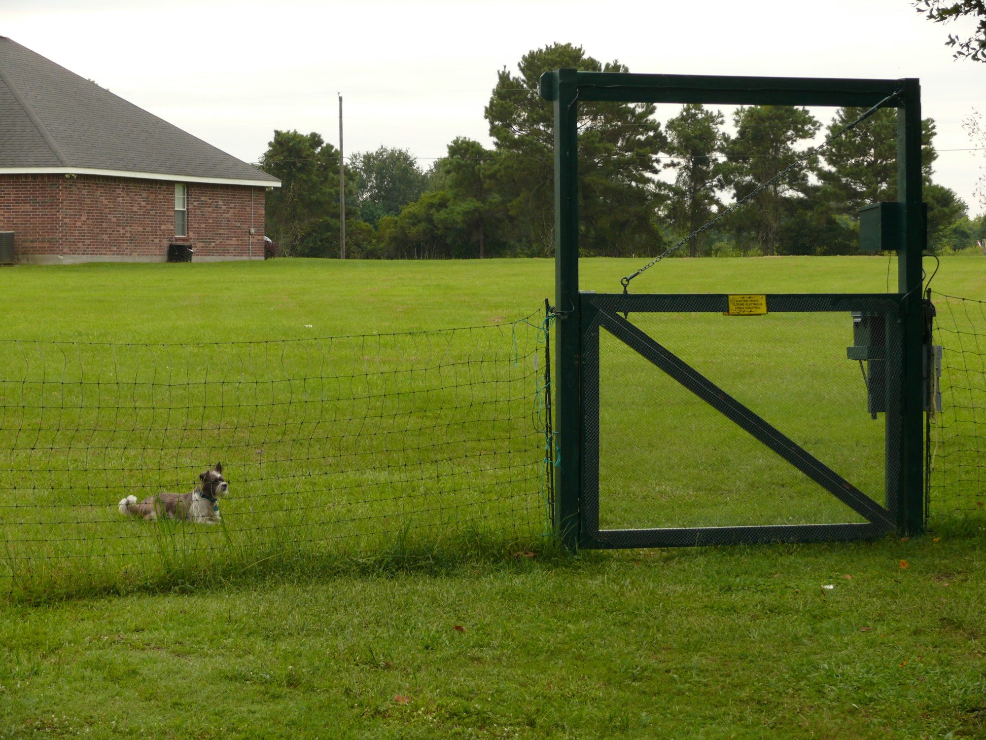 Looking out of the pen toward our house and road beyond. The fence and the gate are electrified. I haven't yet run power out to this area, so am using a charger that can run on AC or DC. I have a car battery in the box to the right of the gate. My buddy Max is patiently waiting for me to finish taking pictures.