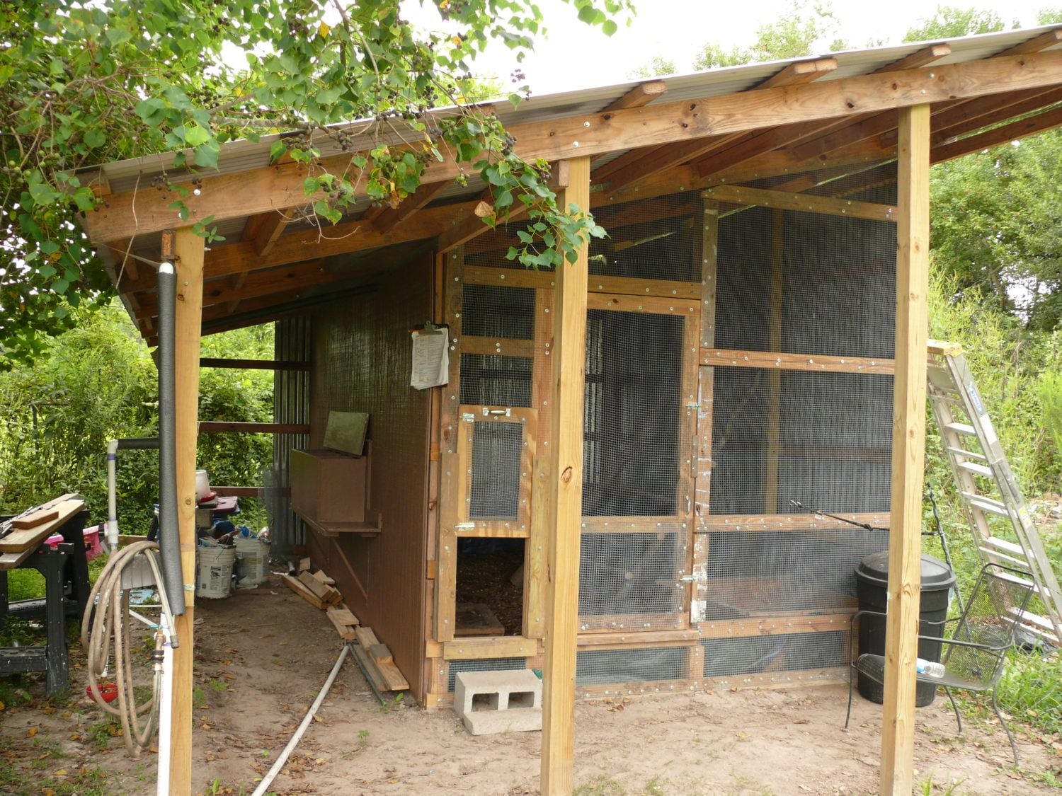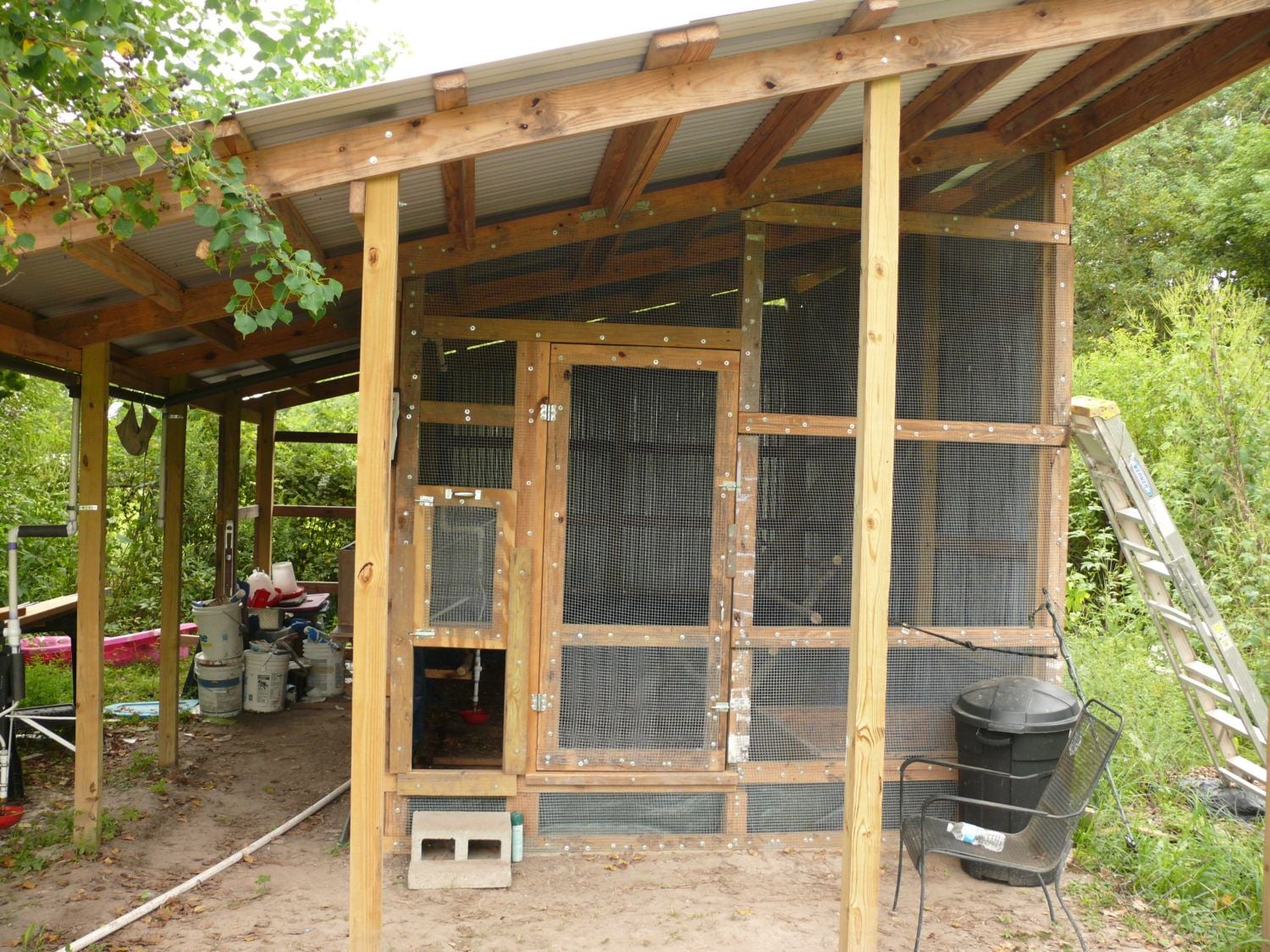 Continuing with the idea of plenty of ventilation, the peak of the roof is about 12 ft. The heat coming off the metal roof is pretty intense in summer, and even though I try to let the girls out into the pen early in the morning, there will be times that I will have to leave them inside all day. Also, having the peak of the roof that high allows for a clearance on the lower (left) side that is easy to walk under. I can remember from childhood when there was a surge in folks near my grandparent's house around Provencal, LA that decided to raise large flocks of chickens for commercial purposes. The long, narrow metal houses for the chickens had roofs too low, and the coops had few if any fans. It didn't take them long to discover that their low investment, high pay-off plans got cooked, literally! I can remember the sheds sitting there slowly deteriorating long after the chickens were gone. As LindaB said earlier, "heat kills a lot more easily than cold".