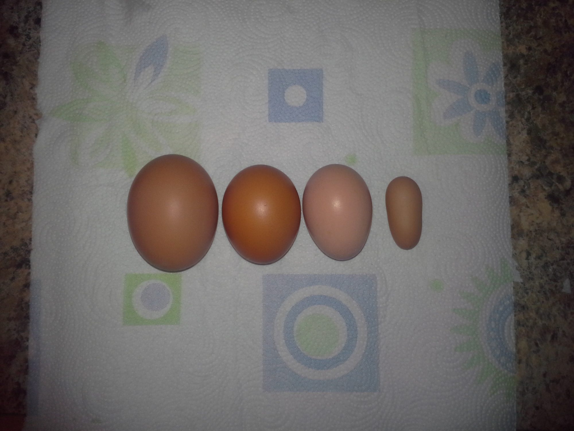 The dark brown egg to the right is extra large and the next one over is a regular large egg and then theres the fart egg