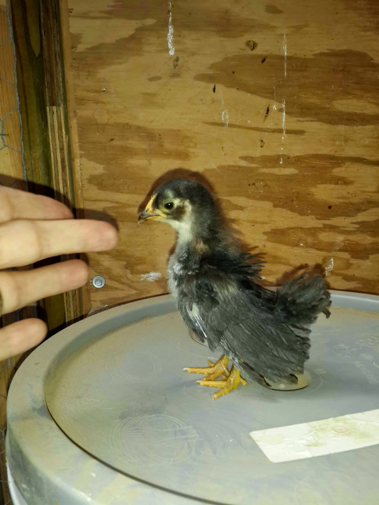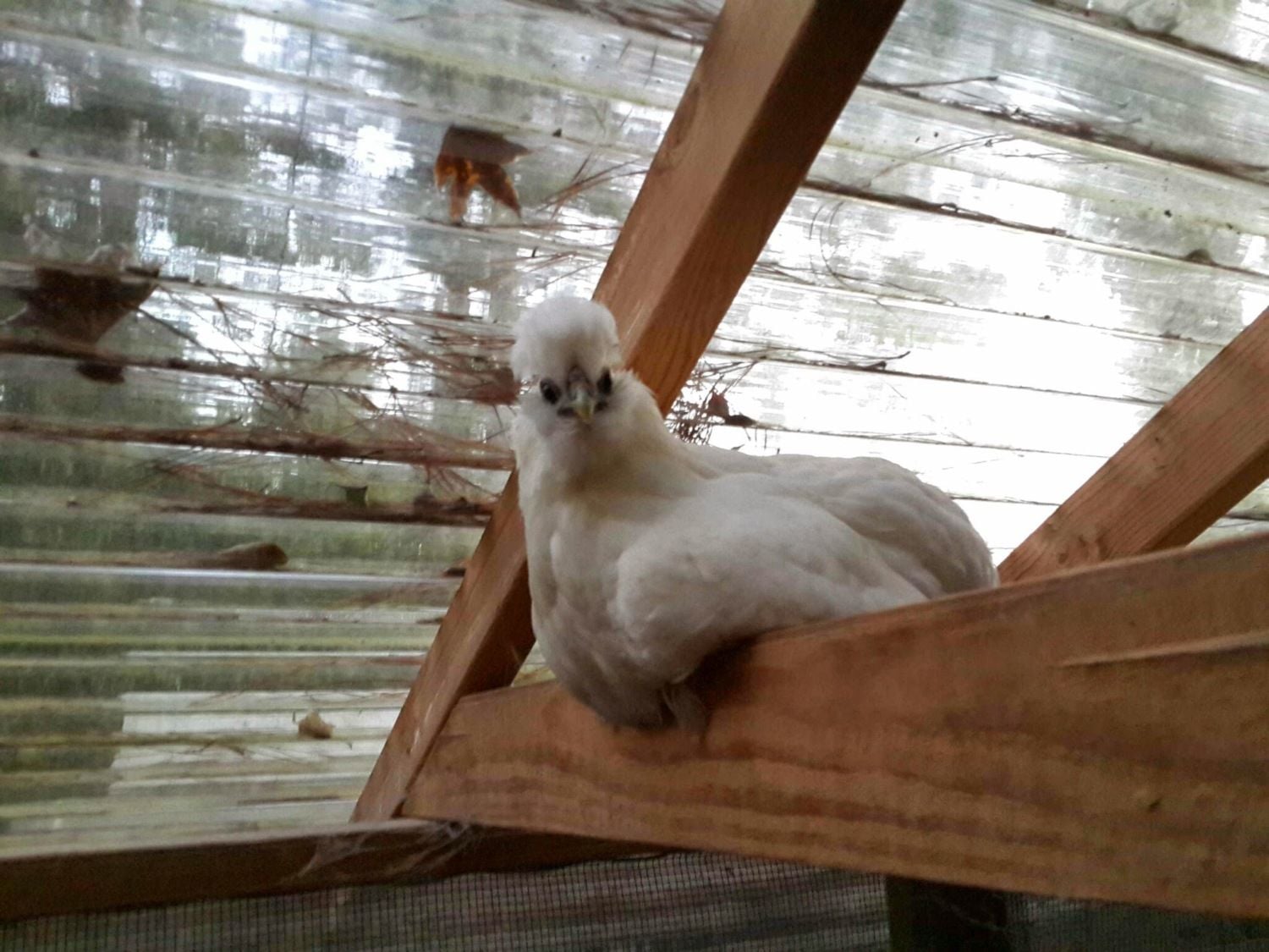 I think she will be a wonderful broody when she grows up. Not to mention that she is cute as a button. We let her run around mostly. The bigger bantams pick on her (mildly). So at night she gets up here in the rafters. Then we get her and put her up safely for the night. Feathered legs, ear muffs and a little beard. So cute.