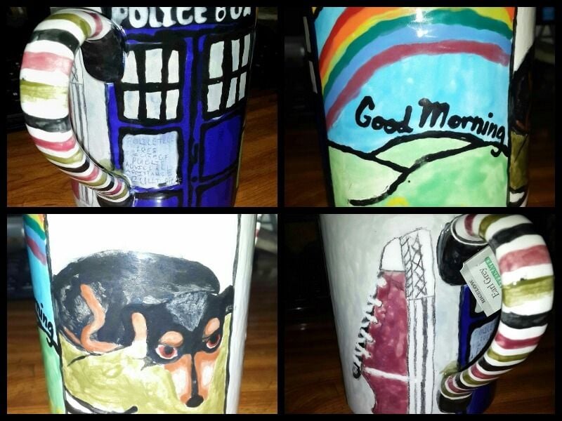 Pam this is a mug my daughter glazed. Its the first time she has done anything quite like this. I love it! Its a huge mug, so I guess that is why she did the 4panels.