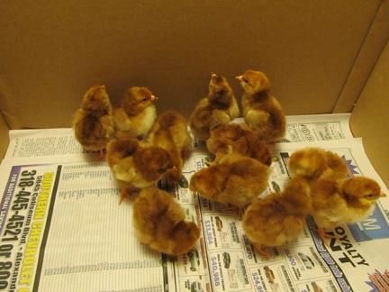 I think so --- the only pics I have of the ones I just hatched are under red lighting, but here's a pic of the ones I hatched 2 years ago: I really like these RIRs. I might spring for another dozen eggs from Dick Horstman's line so I'd have 2 different lines, both good egg-layers to cross. I'm also thinking, if I got hold of some good quality Barred Rocks, crossing RIRs to BRs will yield a sex-linked breed similar to Greenfire's Rhodebars. I wish it would stop raining! May as well take advantage of it & go take a nap! ;)
