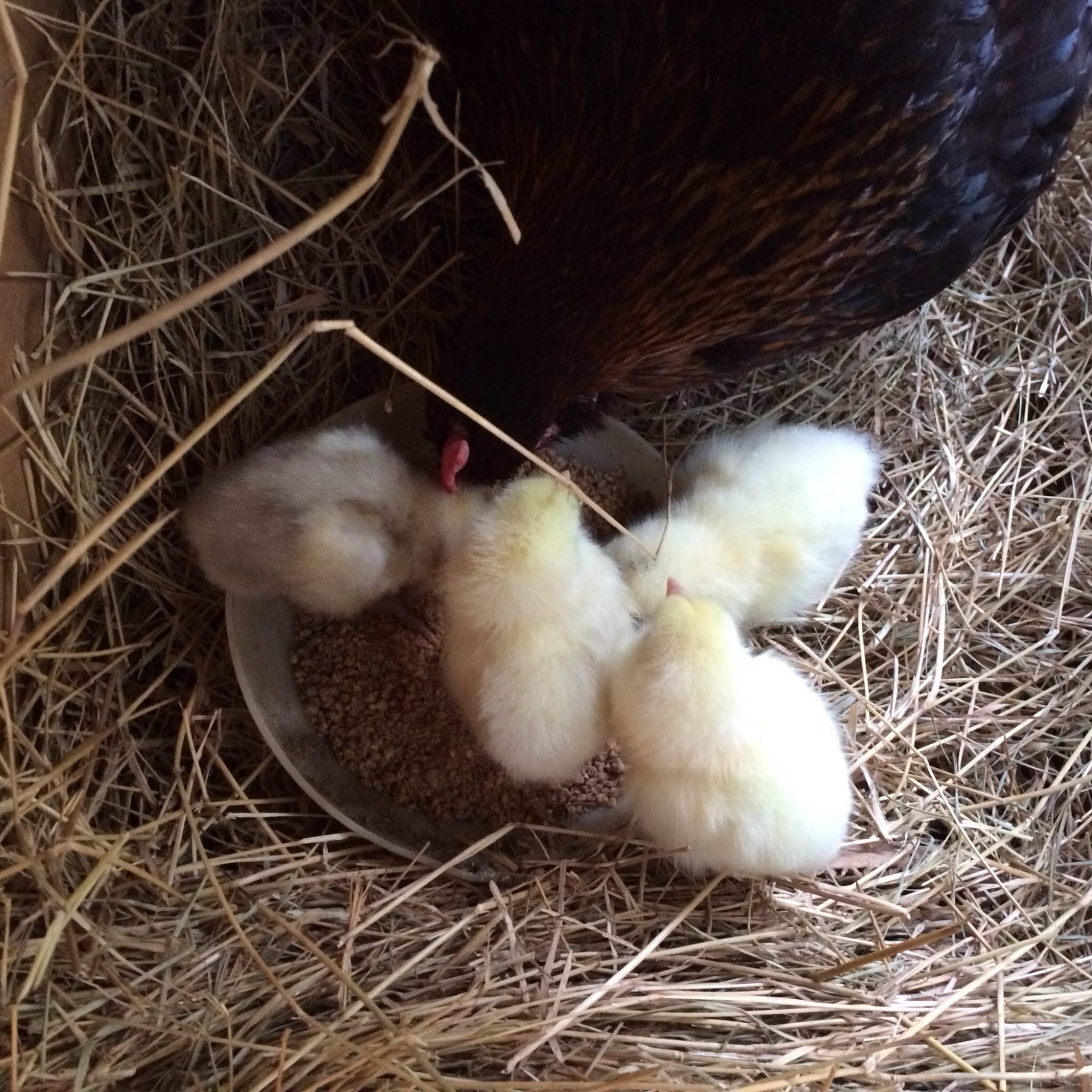 My French black copper marans broody with her new babies! It's the second time she's gone broody this year. Two light brahmas, and two white marans from Cluckin Chicken Farms in Dry Creek. The transfer went really well. She bit me several times, but I did the whole thing in the pitch dark. Slipped the eggs out, slipped the chicks in.