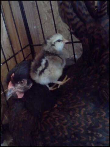 This is my not-even-a-year old Barnevelder hen who went crazy broody...i finally let her have some eggs, thinking I'd toss them when I got the Araucana eggs I ordered. But then i checked them, and saw one almost ready to go, i hadn't really paid much attention to the age of the eggs and how long she'd had them...so i let her hatch it...here's "her" baby...i wish i'd let all my broodies raise chicks, this chick seems so happy, using mom as a playground, hiding under her skirts when i come in.