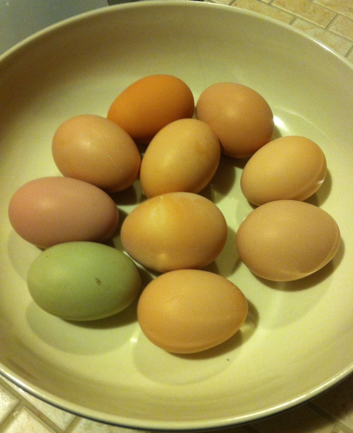 Yesterday we had 5 eggs! 4 in one nest and 1 in another "real" nesting box. Got our first green egg! Monday we had 3 and Sunday we had 2. We have 20 hens who free range. They started laying about 3 weeks ago. How many and when should I expect to see on a consistent bases?