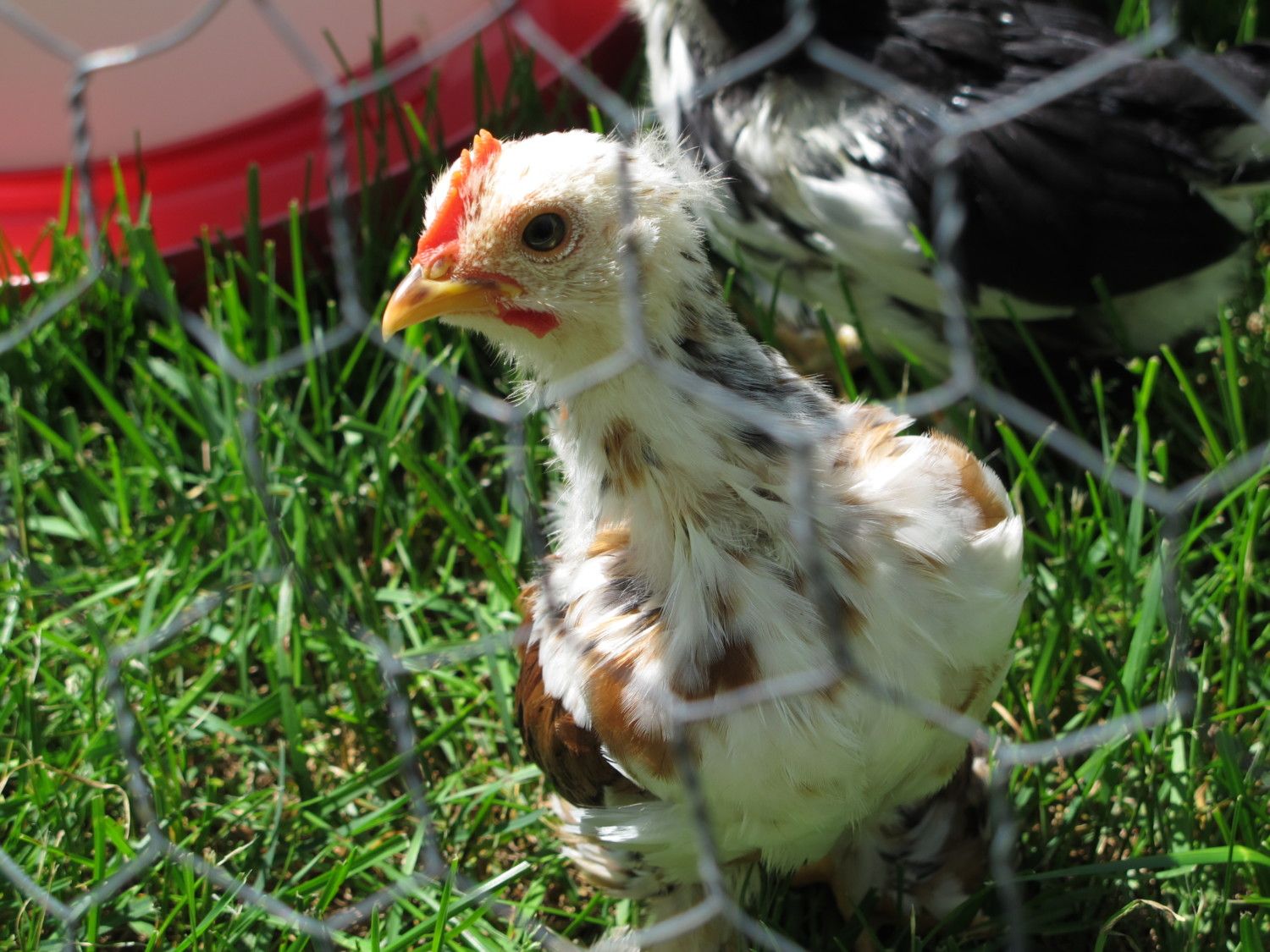 And my 10-week-old cockerel from the BCMC as well. He started out black mottled and now has red throughout and is beginning to get some buff spots in as well. He's very handsome. Not a very good shot, but it's just to get an idea of his coloring