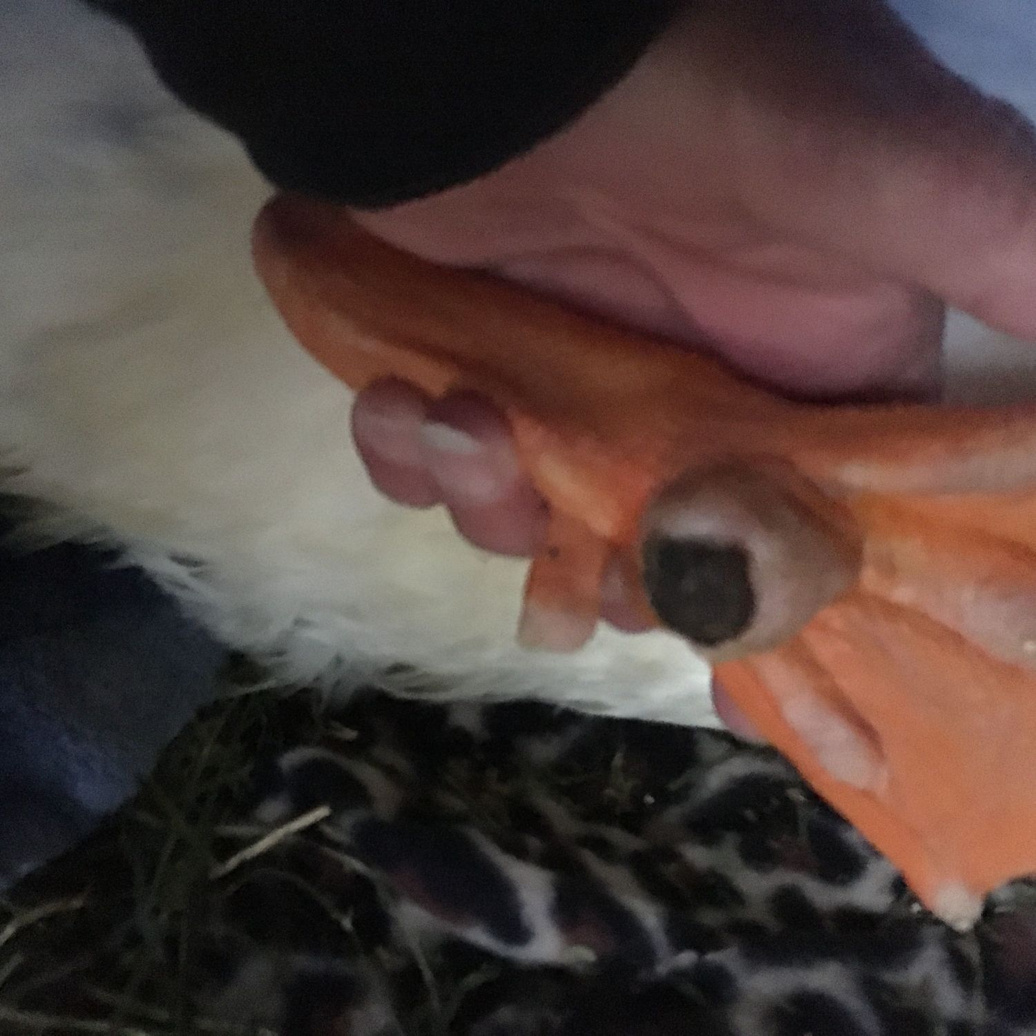 My peking duck started limping and now can't stand up, I found this on the bottom of his foot.