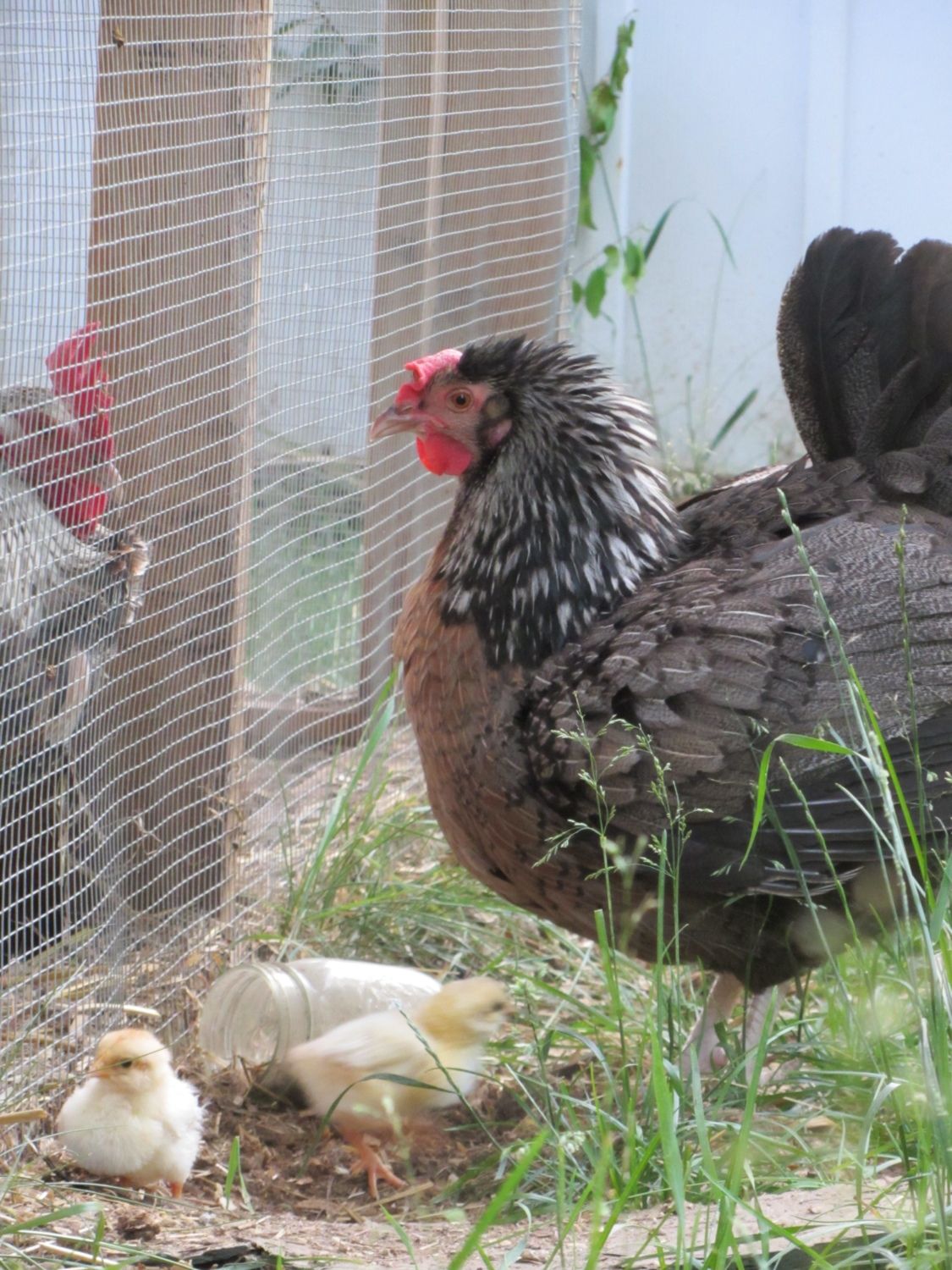 This was in June, just getting around to posting it now. My Dorking mama, with her Dorking cross babies, was mad at whoever was giving her the stink eye on the other side of the fence