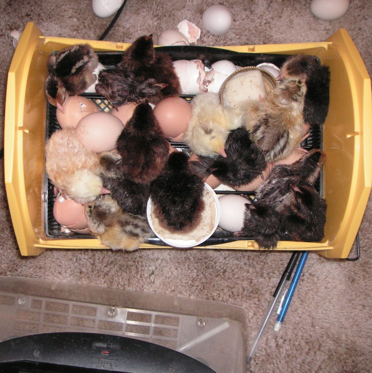 Well I have 14 chicks out of 24 eggs set. I don't think that is all that bad for a first timer!
