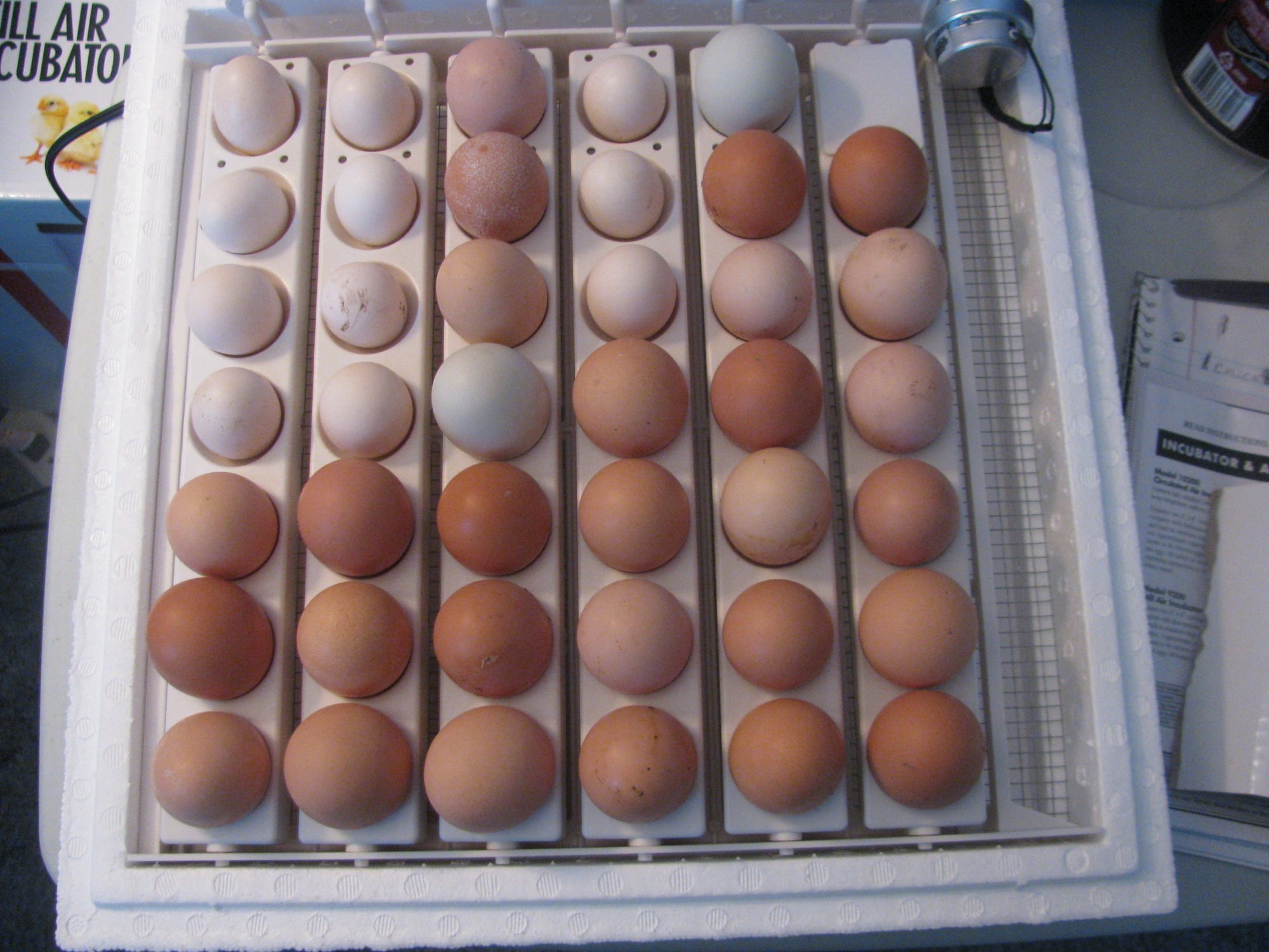 Ok Today I set 41 mystery mutt eggs in the bator. I had to get them in to make room in the spare bedroom for my little sister to move in. Her conditions to move in were "No boyfriends over here, Help with groceries, and you have to deal with the incubator in your room"![]()