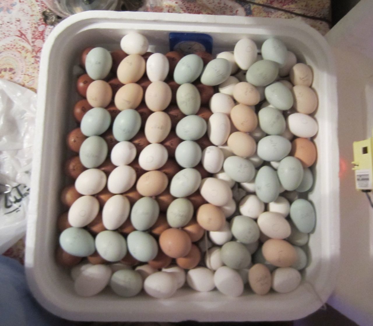 Yaay, my name isn't on the list anymore, but I just remembered something! I also set some Exchequer eggs the same time I set the ones I counted for this contest. 5 are viable. Oh well, that would me..because they are in a different incubator. If I count those 5, plus take away the three I had to throw out, that would make 34 eggs. See, I can do chicken math before the are hatched..wait..they haven't hatched yet, and I know better than to count my chicks before they hatch.If I remember right, I think we had a couple of people setting Button Quail today! So today is the last day that anything would be set! So now it really is wait wait wait. Along those same lines, I almost have everyone tallied up on how many eggs were set and after the last few get put in today I will finish totalling them all up and announce a winner for the Number of eggs set contest! YAY!!!