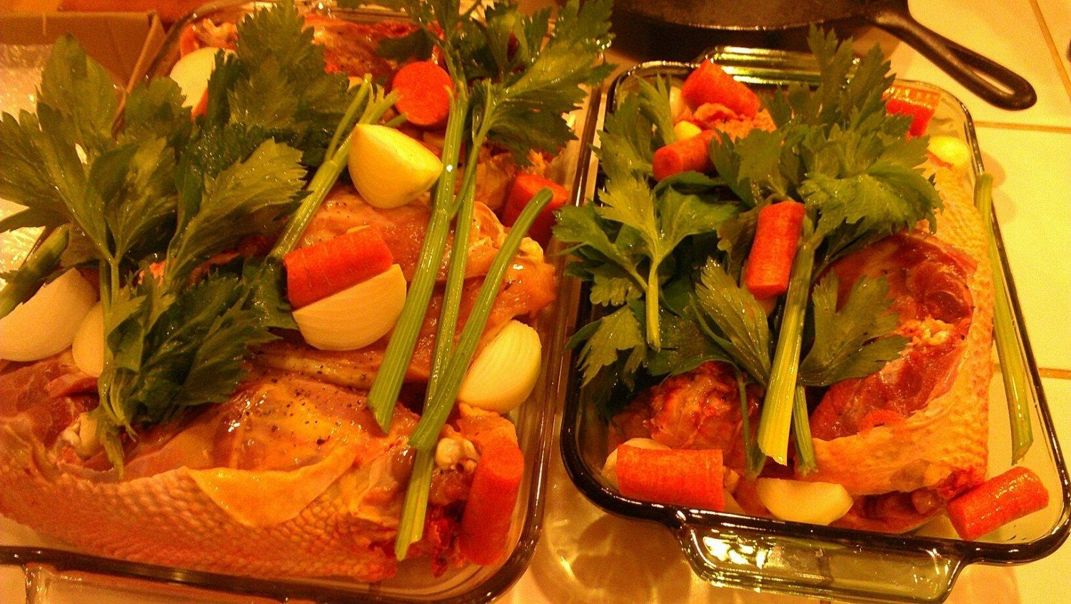 As far as making stock, this is what I do: bake the leftovers with some celery, onions, garlic, carrots, salt and pepper until they begin to brown (depending on how much you have 350ish for 40 to 120 minutes). Then all of it goes into the crock pot, add water up to the top of the stuff, and simmers for about 24 hours (stir every few hours, don't add more water) until I can't stand the greasy chicken smell in the house any more and the meat falls off the bone. Then I pick through it, saving the meat to freeze for stew meat (be very careful to look for small bones - I tend to "squish" the meat between my fingers to feel for bones), and strain the stock. The biddies get the bones (the smaller bones get soft and the biddies eat it), veggies and whatever meat I couldn't get out to pick through. I put the stock, covered, in the fridge for at least overnight (but usually can't get to it until 24 to 48 hours), which causes the fat to rise to the top. Skim the fat off, save it for cooking or for something else. Bring the stock back to a boil, and then pressure can it or freeze it if you don't can. It's good for about a year. I find it to be a very delicious stock for starting soups and stews.
