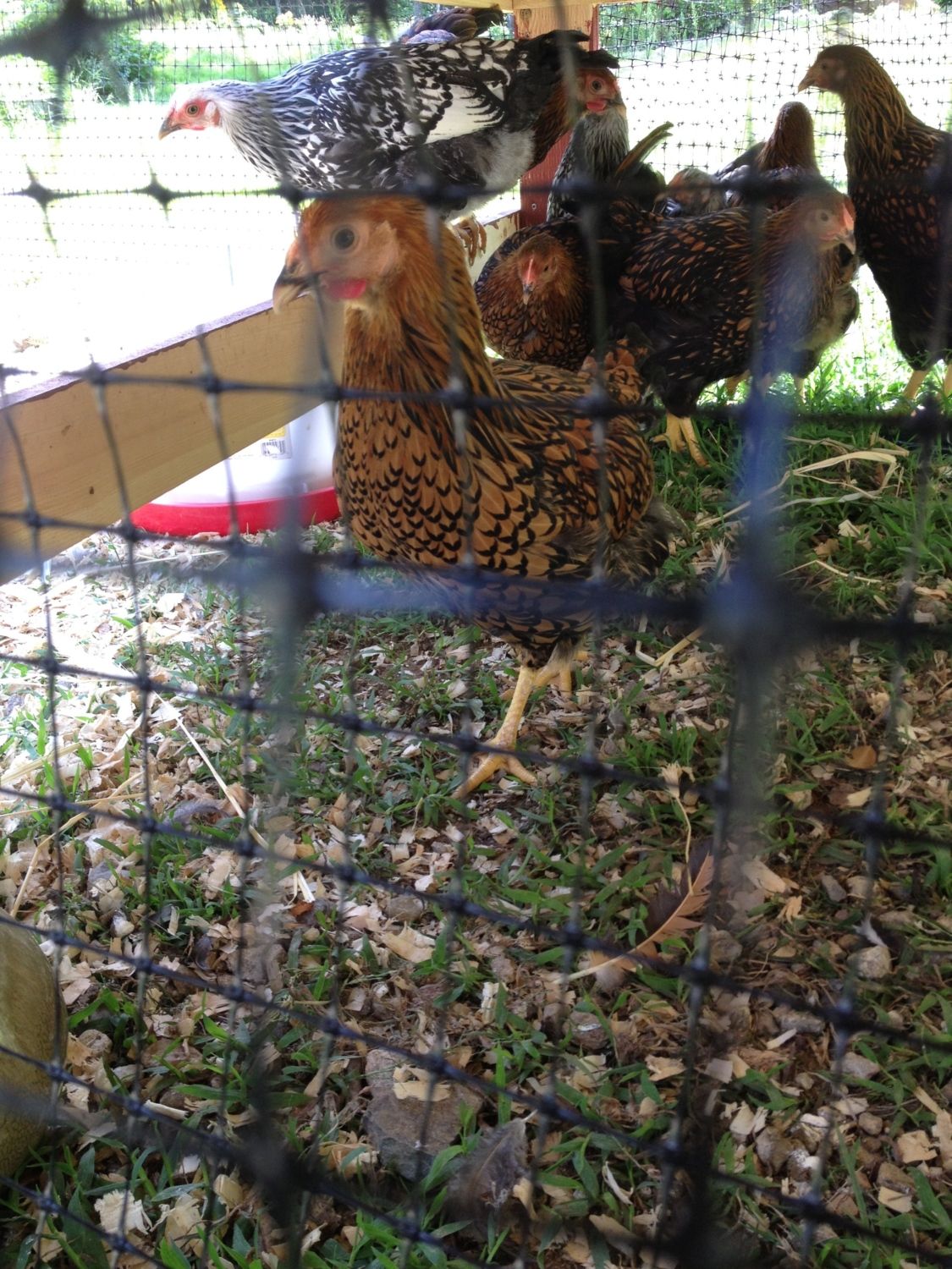 My pullets aren't laying yet, we heard the "egg song" the other night. I am not sure how old they are. The person I bought them from said they should be laying by mid September. They have grown a lot since I first got them. Today, I turned the straw over, coop still looks clean and dry from the big clean on Sunday. I totally cleaned it out, started fresh with three inches of pine shavings and straw on top, going to try the deep littler method for winter. My cousin swears by it. No eggs in the nest boxes yet, they were all stacked in them when I locked up last night. They were all on perches when my DH opened the door before work. Pretty lazy day here because of the heat. Fed the girls a bunch of insides from a cantaloupe. Other than that the dachshund puppy and golden puppy dug a huge hole in the back yard while I was checking the coop. The three senior dogs rolled in the dirt with them, so I got to wash five dogs after the coop was clean. Thank goodness for a deep laundry room sink!