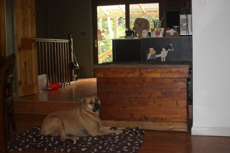 go back out onto the porch, reading the mail, and the dog tears off the deck charging behind me,--another fox, orange black and white,,,running off with another chicken,