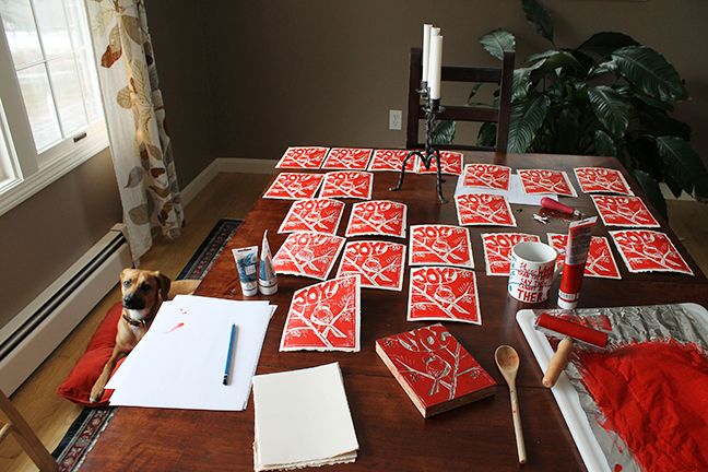 and here is today's project. Lino cut xmas cards. This has become a tradition but boy is it time consuming and occasionally infuriating. The cup is full of coffee spiked with Remy to help me survive it :D