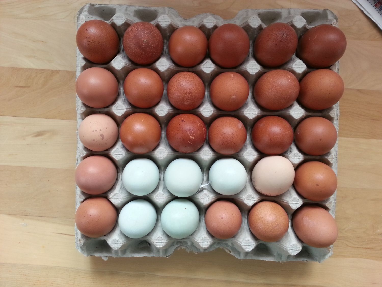 wife2abirdman, if you are looking for cockerels from really dark eggs, you will likely not find mine acceptable. Here is a photo of the eggs that they hatched from, but unfortunately, I don't know which is which. I imagine the 4 darkest eggs were the BCM, and none of those hatched, but I think there were 18 Marans eggs total.
