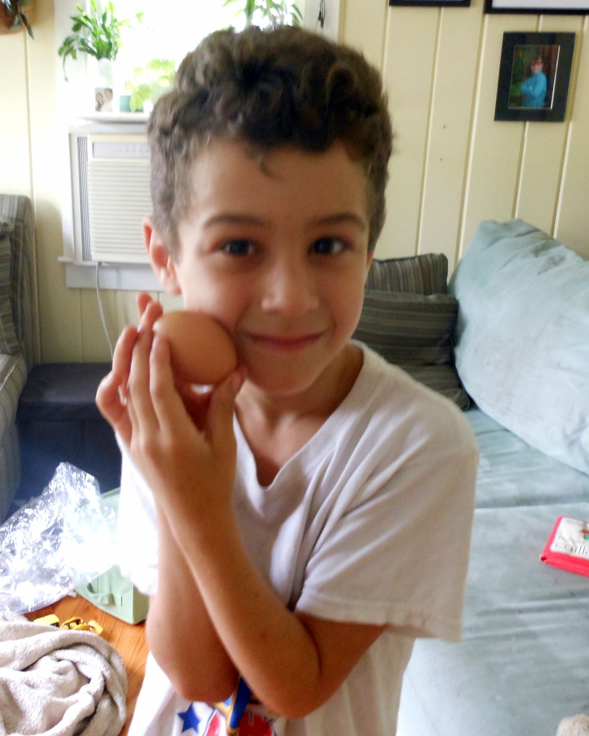 Adam holding our very first egg. He was thrilled that it came from HIS chicken.