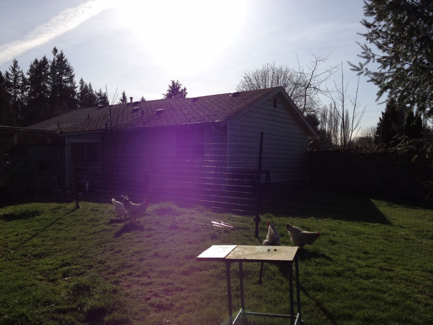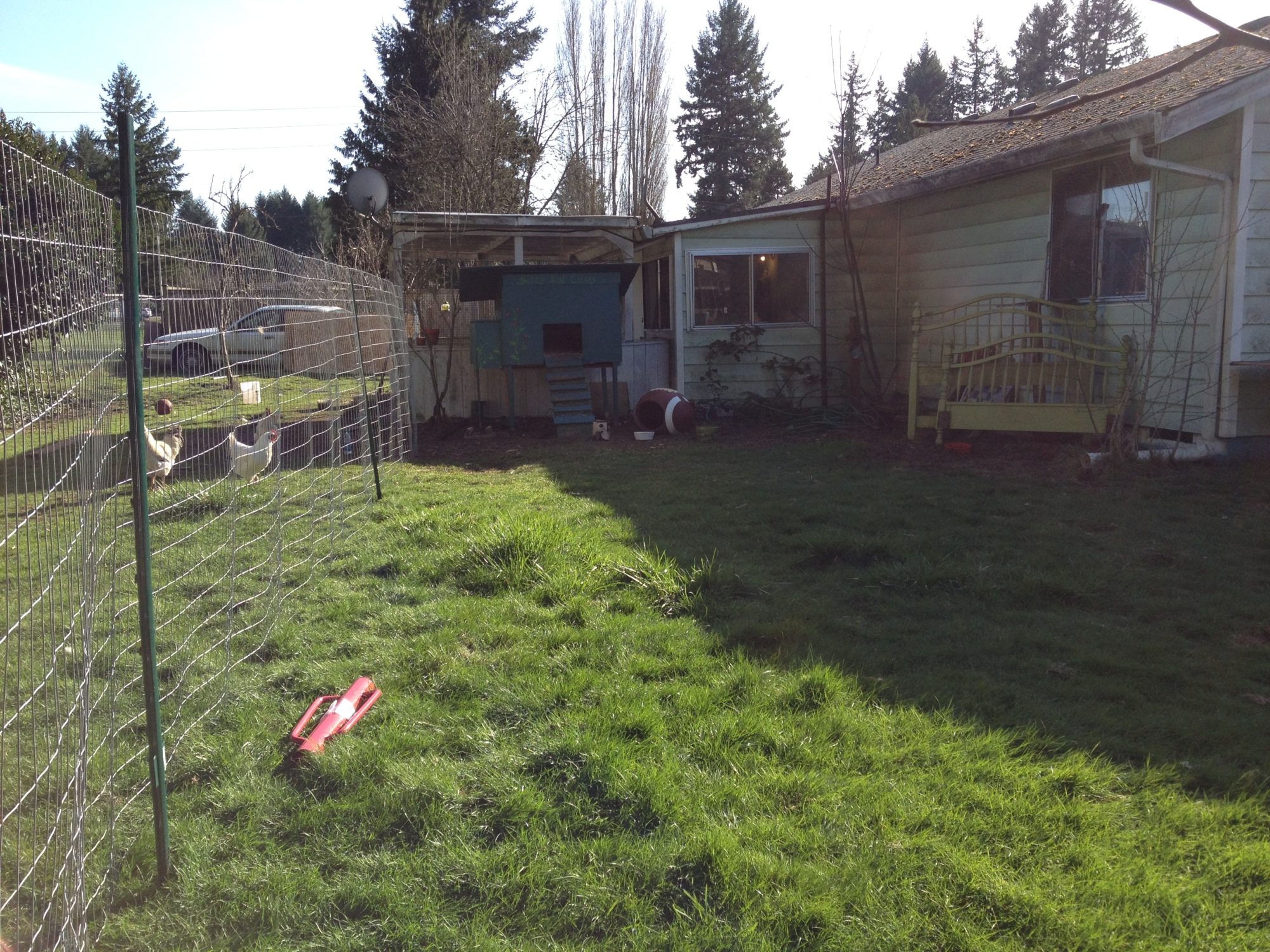 So Little Jerry is NOT liking being inside the fence. He has been crowing nonstop. The girls seem to be fine. I still have some places to add poultry wire that are on the porch that is connected to the run... I have them blocked off for now but it wont be hard to staple something in those small areas... With everyone in there place, this means I can start learning how to garden.. I can utilize my fire pit again and set up my patio table again when the sun comes out and have a little pool for the dogs and kids to play in without worrying about chicken poop.