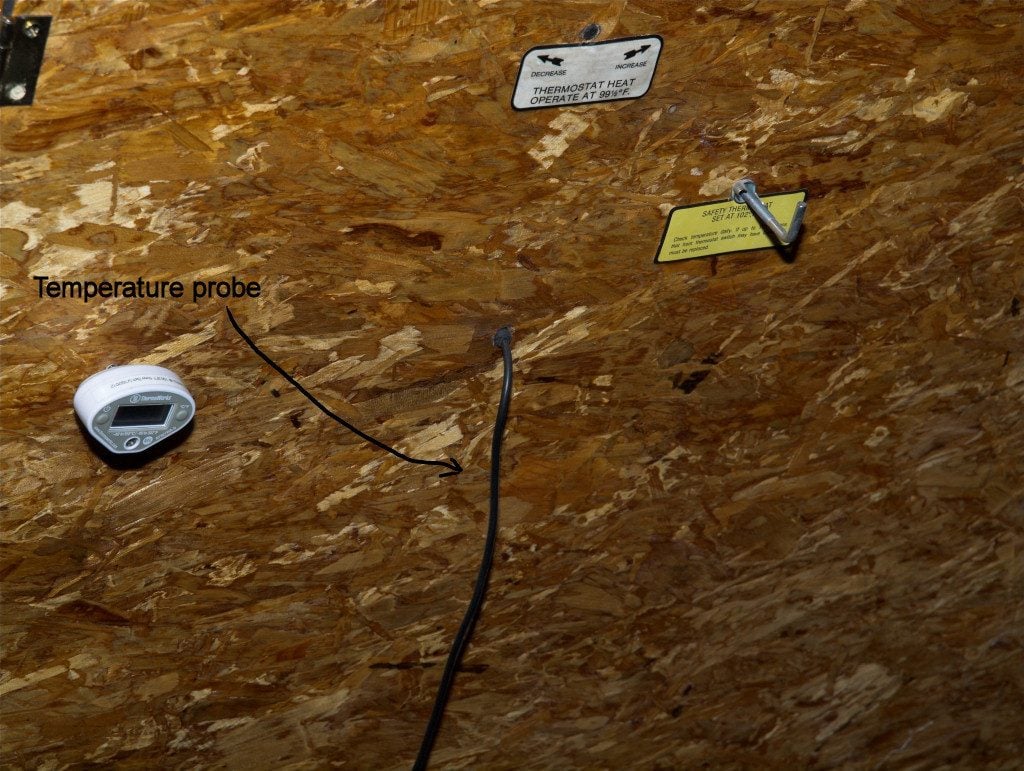 I currently have the temperature probe hanging over the center of the top tray at a level even with the center of the eggs. I made a ceramic egg and intend to insert the probe into the center of it, fill it with water and seal it and them place the egg in the top rack.
