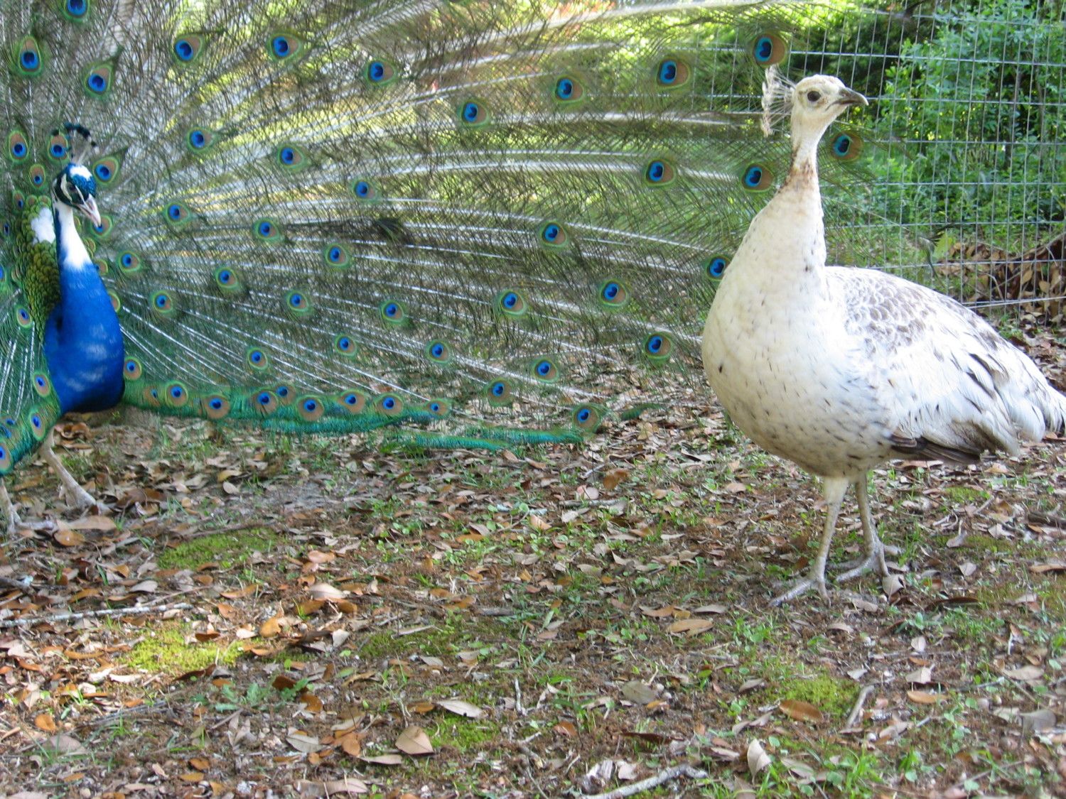 When the peacock tries to mate with the peahen, he makes a "Weeeaaaaaaaawww" type call that sounds funny and as he makes it he runs at the peahen with his train still open. He won't chase her far, sometimes only just a few feet. If she keeps running he doesn't pursue, but if she lies down then they mate, and as they mate he keeps his train fanned out which is probably one of the more beautiful animal mattings (not that I like that topic). I have seen my peafowl mate a few times, and my peacock Peep tries to mate with my foot normally once a day (like today). He runs up making the mating call and pecks at my shoe and scratches it then backs up.
