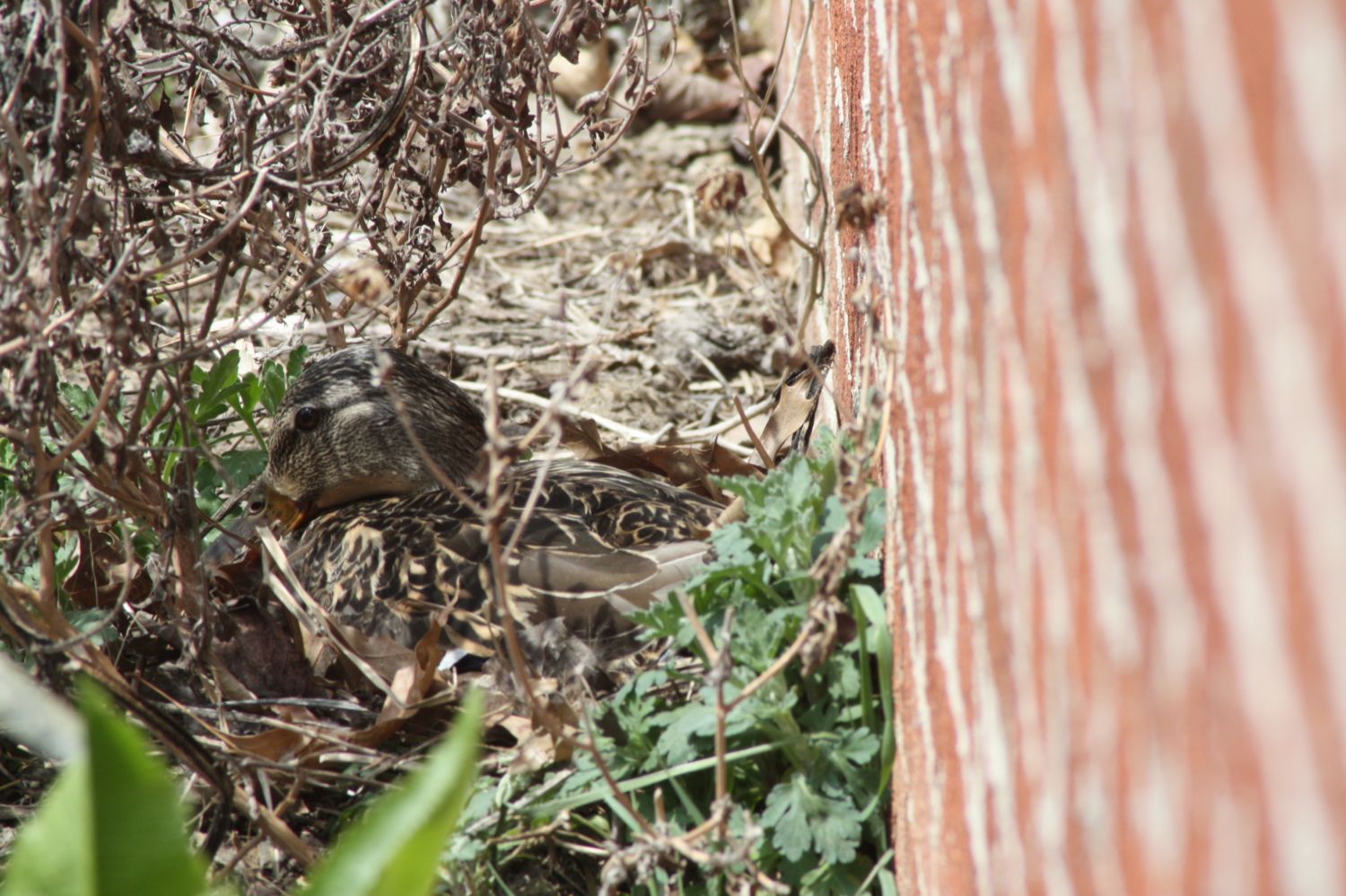 I was recently startled by a female mallard duck, as I unknowingly got to close to her nest. Up against the side of my house, behind my dead brush from last years mum plant but also in my main garden. She is sitting on 8 eggs.