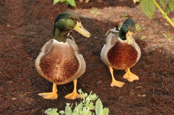 I truly think you have a male and female....If they were both males, both would have the green on the head. But I am probably the last person you would want trying to help you sex a duck. LOL. I have 3 rescues myself and one purchased drake. He was supposed to be a Mallard as well, but I have my doubts. But the others, well they started getting their adult feathers, it was pretty hard to not see which were male and which were female. The males all got the green heads, and the females all turned brown with no green in sight Other than the tops of the heads, they all look pretty much the same though. Their bodies are all brown right now. Except for the grown drake I have. He is graying out after moulting, but was colored out when I got him. I hope this helps and doesn't confuse you even more...