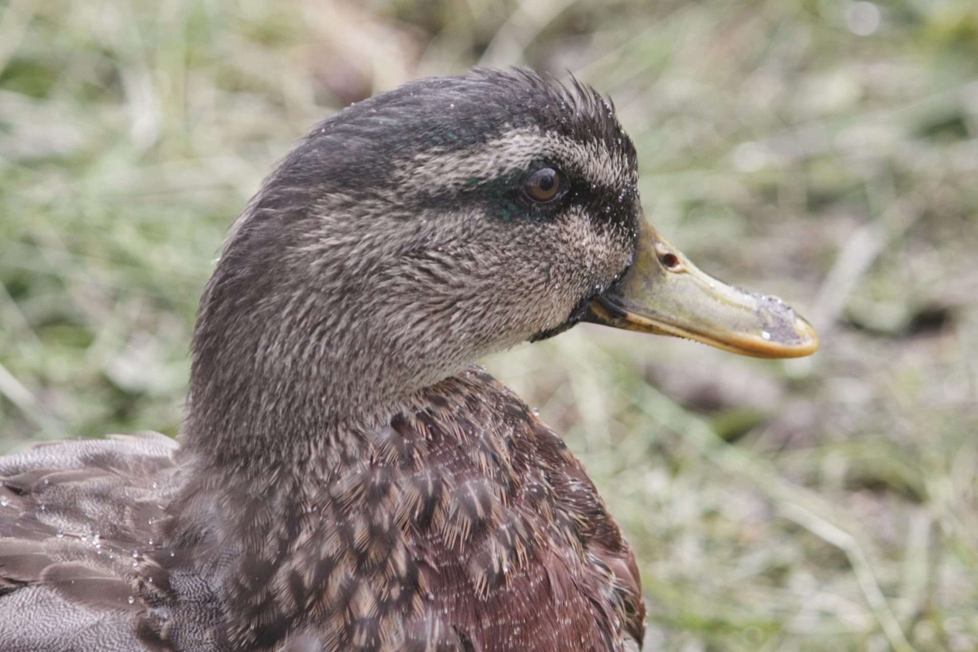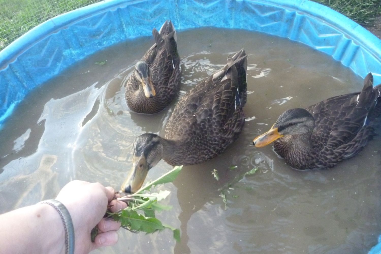 Blue/grey? That's different. I've seen the girls' bills go almost brown/black, with very little orange, and the boys go anywhere from yellow to green, but never blue. Males will start molting between 2 and 3 months, from my experience, and that's when they get their signature green head and tail curl. But their bill color changes just before that. Obviously with most ducks, voice-sexing is the first way to tell, but with your "oddball" I'm guessing you'll have to watch during the next few weeks and see if it starts changing colors. Below is my Dexter, when he was just a couple weeks older than your ducks, so can see what to watch for (he's the one in the middle in the pool pic)Another thing about the bill color, it seems to have a blue/grey hue to it. Shouldn't the tail feathers have a curl by now if it were a male? My mallard also lacks this.