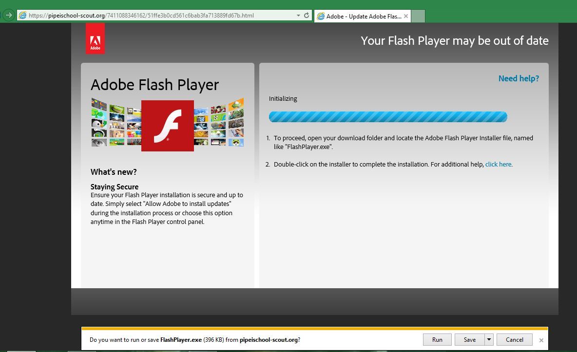 The stuff is arriving through ad Servers (Google and elsewhere). I keep Flash in Chrome always set to: (Advanced Setttings: Privacy/Content Settings/plugins) this allow one to Rclick on icon and choose to run (or not). And as this "invite" to update Flash arrived while I was uploading photo above? Cheeky scum (not actually Flash Related). Anyway, the first time this showed up was about a week ago while reading an article from the archives of the New York Times. Machine is clean and the current attempt to exploit only works if one clicks to install following download (meh) - and I'm sure it will get whack-a-moled RSN. Only one person had reported the address listed from your image of page: https://safeweb.norton.com/reviews/308837 The address used today had yet to generate complaints, anywhere: https://ohghimafiameme.com/2273097305777/e5a694f3c885372400036ea92767fc33.html - don't bother clicking - you can never get "there" from "here" with the address from which the BS was sent - one has to invite the vampire in by clicking install, then off one is sent to be "dosed". For those interested in drilling into the particulars: https://www.fireeye.com/blog/threat-research/2016/04/cve-2016-1019_a_new.html Run Malwarebytes (and the adwcleaner - linked to in Malwarebytes): https://www.malwarebytes.org/
