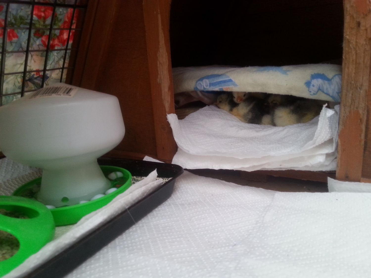 I'd take the food and water out of that tray and spread them farther apart for ease of access for the chicks....and maybe remove the pile of towels in front of the MHP.