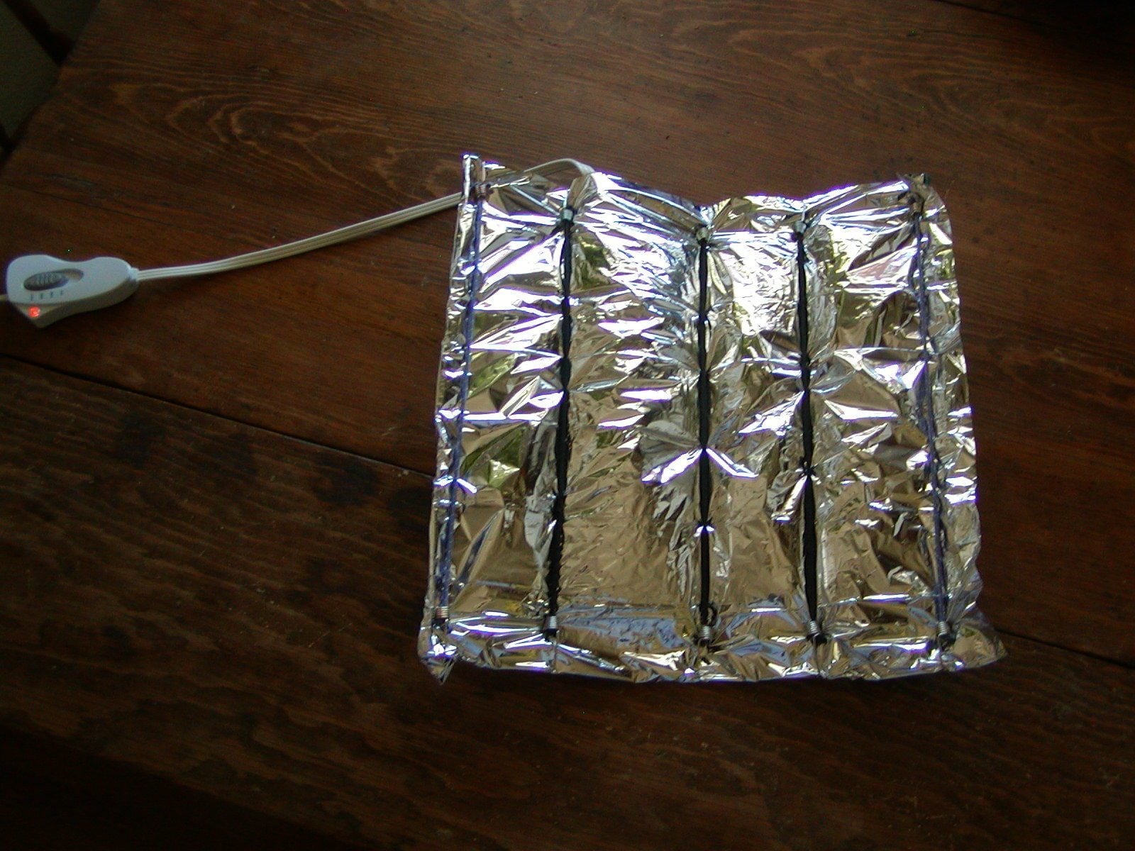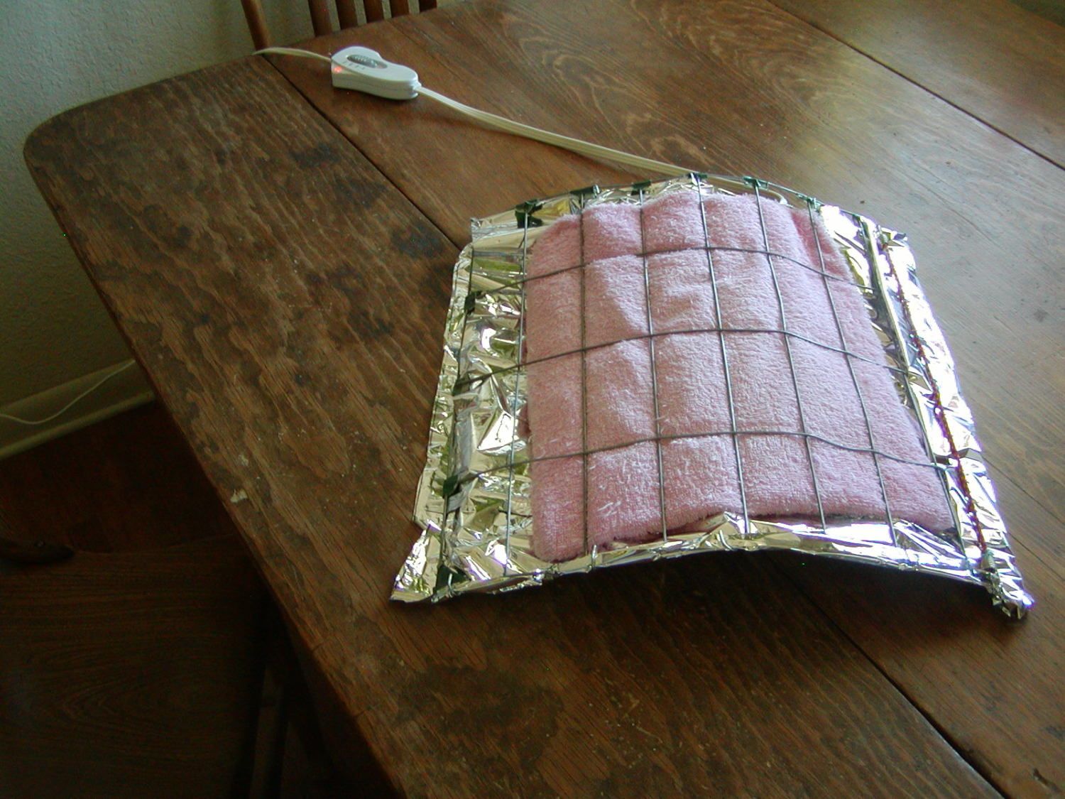 I measured the temperature of this little lab experiment and it read 85F when the pad was on the highest setting, about what everyone has been getting with their various MHP setups. For those who aren't familir with space blankets, Mylar is not the same as aluminum foil. It's more like a reflective plastic or nylon material, so don't worry about chicks getting electrocuted by some wayward electricity.