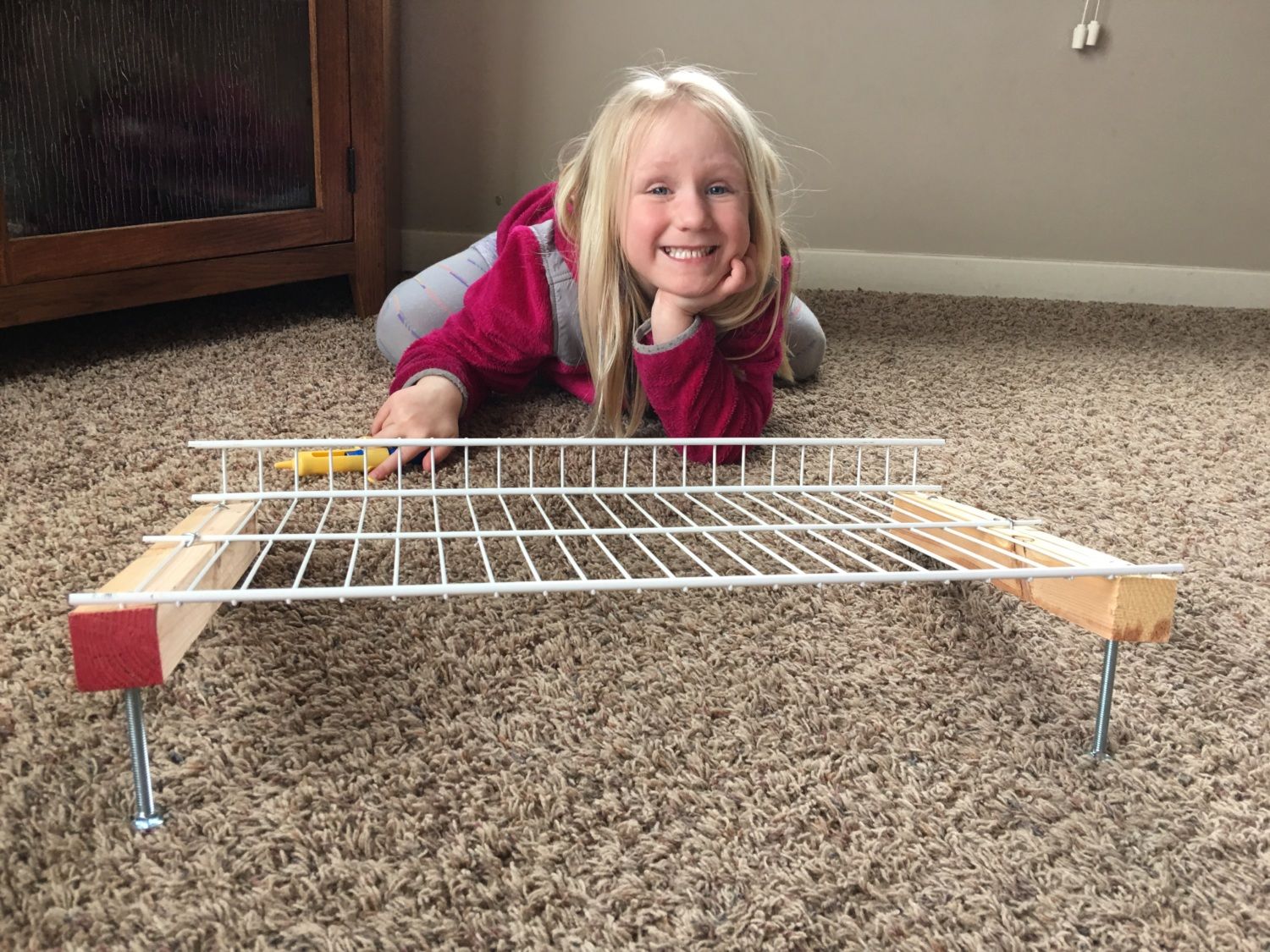 Now in all seriousness, that design in Aart's post above is what I used when I lost the two chicks. They crawled under the block being held up with the screws got stuck and died. If you use it I suggest you cut "shims" and drill holes in them for the screws to pass through. When you raise and lower it put the shims under the block so the chicks cannot get stuck under it.