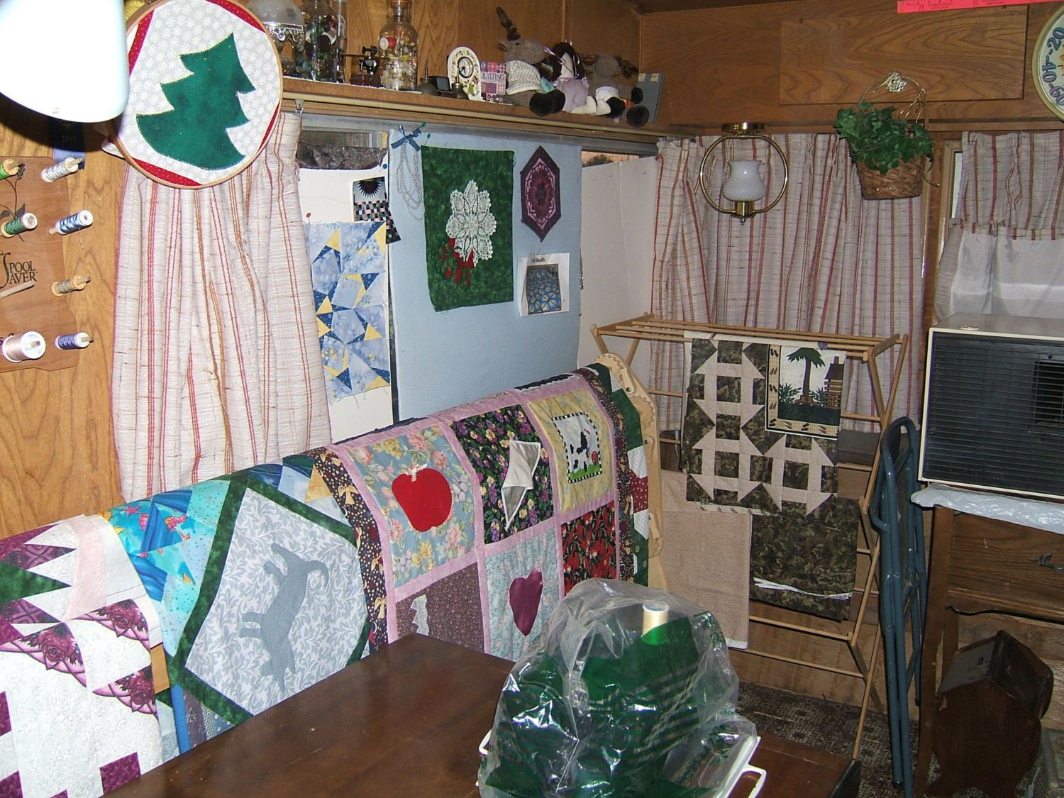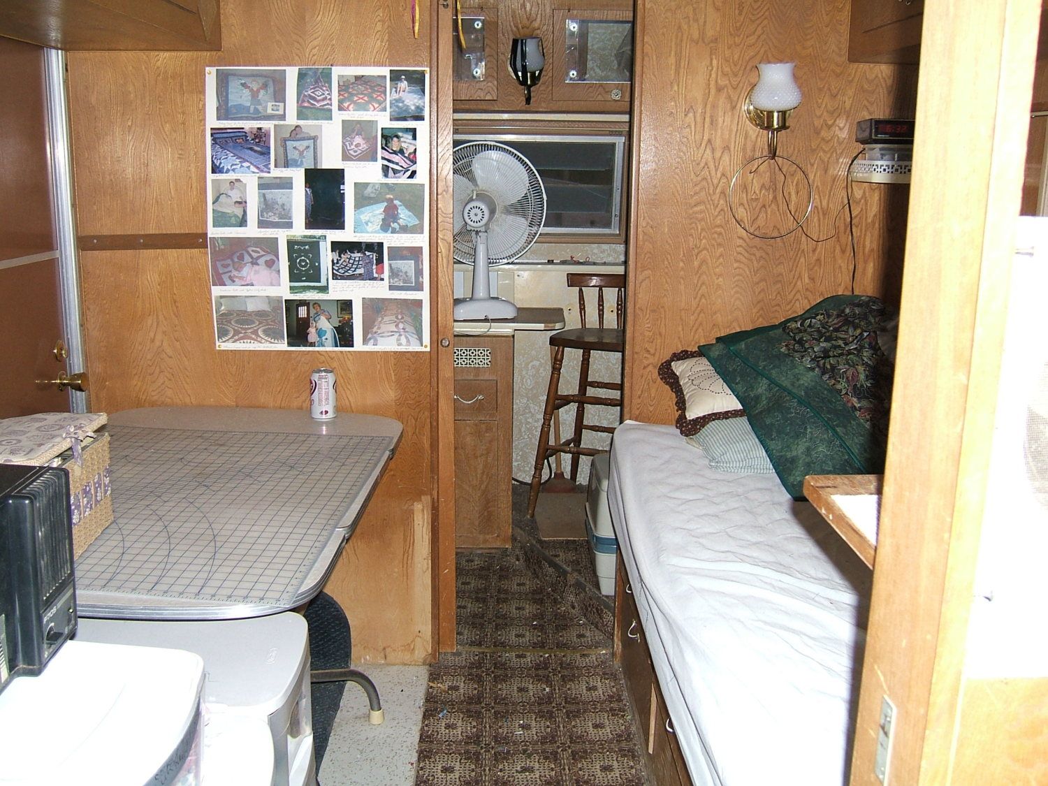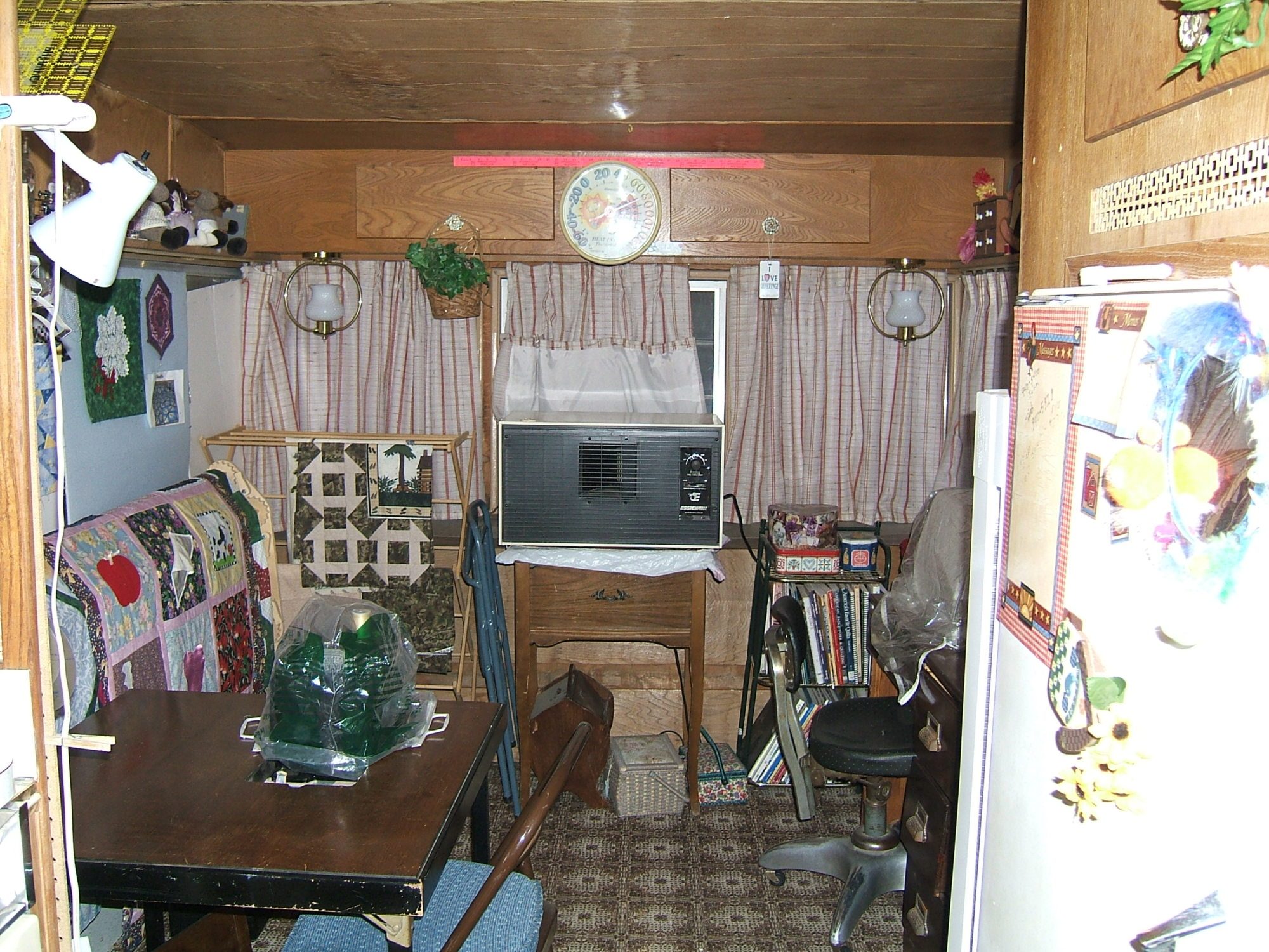Yep, sewing camper. I am a avid quilter, and in this house there was no room for my sewing, especially after we got custody of grandkids Jamie and Little Diane. A friend had a big travel trailer that they used to use for the guys who used to come up and work the beet fields in summer, but they had stopped raising beets so the camper was sitting empty at the edge of a field. She asked me if I wanted it, and then she and her husband hooked it up to their pickup and brought it over.I read this a hundred times and It finally clicked with me.... Sewing Camper? Wow what a concept.... off to go look at craigslist